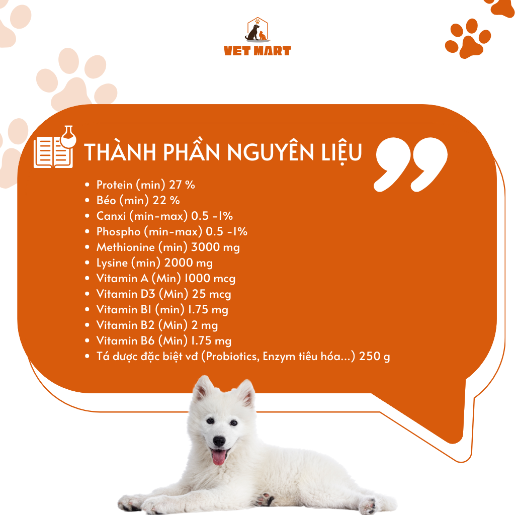 * Bổ sung vitamin tổng hợp, acid amin, khoáng chất thiết yếu và các vi sinh vật có lợi cho đường ruột chó mèo. * Hỗ trợ các bệnh về xương khớp (khớp bị đau,