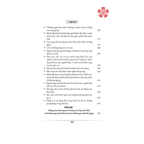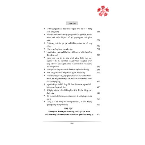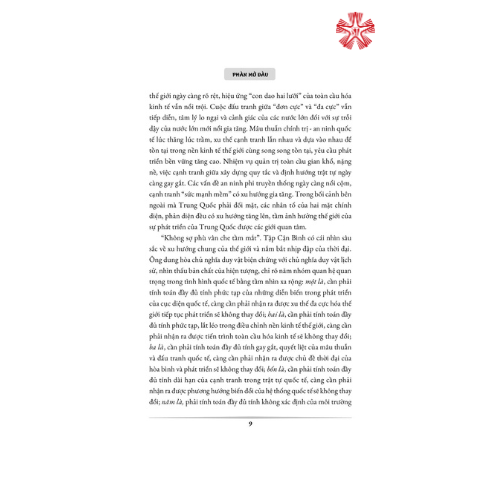 Cuốn sách gồm bốn phần: Phần mở đầu; Phần hình ảnh ẩn dụ; Phần ngôn ngữ đời thường và Phần trích dẫn thơ văn; là các bài diễn văn trước công chúng, bài trả lời phỏng vấn báo chí nước ngoài… của Tổng Bí thư, Chủ tịch Trung Quốc Tập Cận Bình, được diễn giải gắn với bố cục tổng thể đổi mới lý luận và thành tựu thực tiễn của Trung ương Đảng Cộng sản Trung Quốc kể từ Đại hội XVIII.