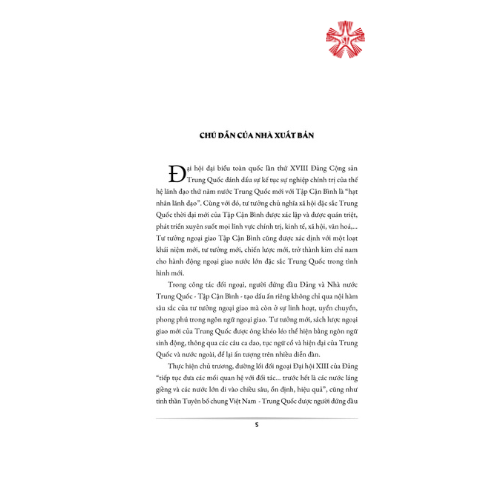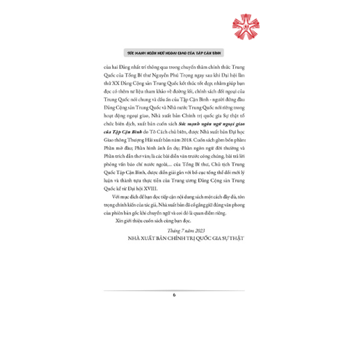 Nhằm giúp bạn đọc có thêm tư liệu tham khảo về đường lối, chính sách đối ngoại của Trung Quốc nói chung và dấu ấn của Tập Cận Bình - người đứng đầu Đảng Cộng sản Trung Quốc và Nhà nước Trung Quốc nói riêng trong hoạt động ngoại giao, Nhà xuất bản Chính trị quốc gia Sự thật tổ chức biên dịch, xuất bản cuốn sách Sức mạnh ngôn ngữ ngoại giao của Tập Cận Bình do Tô Cách chủ biên, được Nhà xuất bản Đại học Giao thông Thượng Hải xuất bản năm 2018.