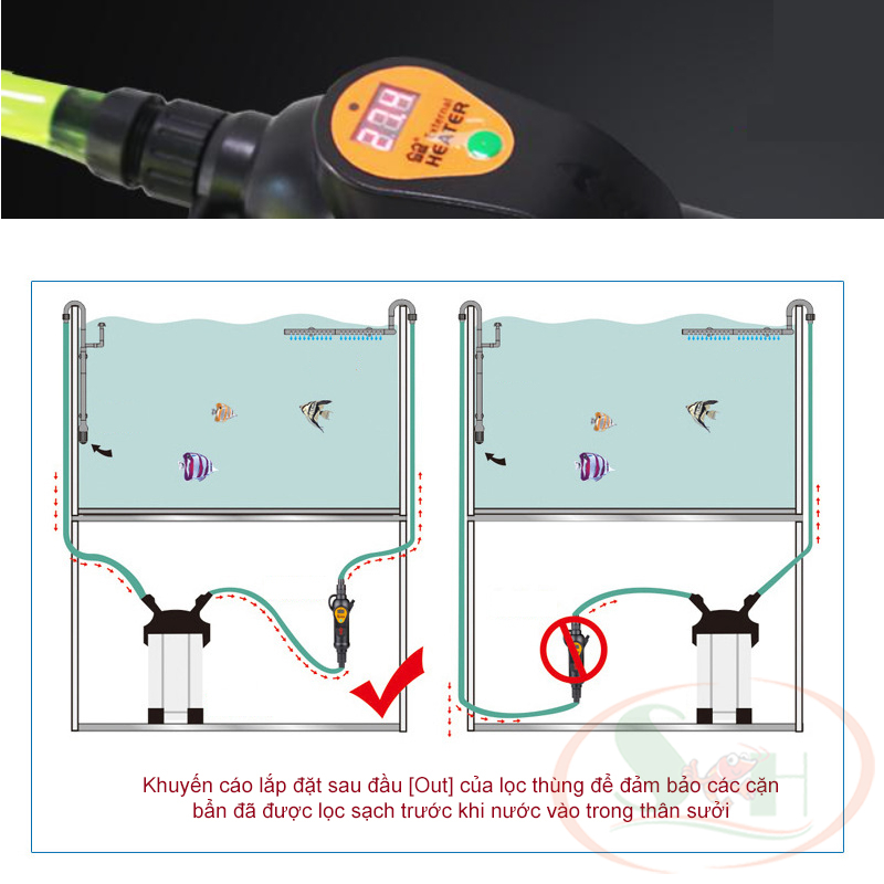 - Sưởi sẽ tự động ngắt khi màn hình hiển thị E-1 (quá nóng), hoặc E-8 (thiếu nước, mạch cảm biến nghẹt bẩ). Nên lắp sưởi vào đầu out của lọc, theo hướng thẳng đứng chiều mũi tên trên thân máy.