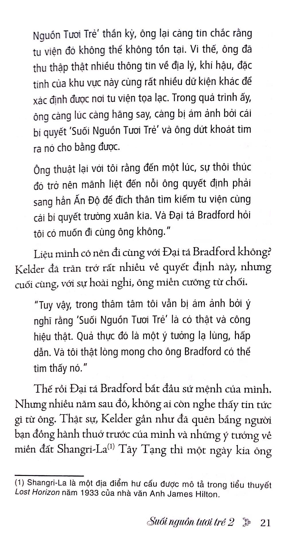 Nếu như Suối nguồn tươi trẻ 1 của tác giả Peter Kelder mở ra cho công chúng một thế giới Tây Tạng không phải với các huyền thuật kì bí mà là những phương thức cụ thể để đạt đến sự “trẻ hóa”, thì Suối Nguồn Tươi Trẻ 2 ra đời dựa trên những câu chuyện có thật, những trải nghiệm của chính người trong cuộc.