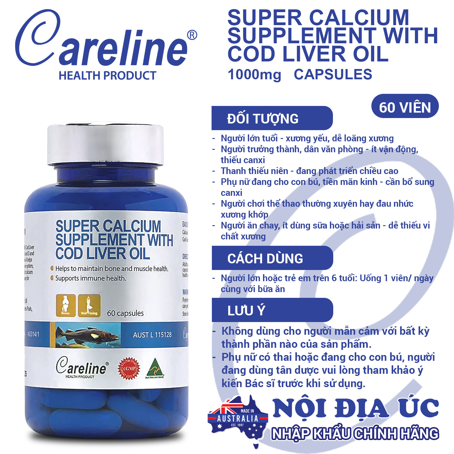 Super Calcium Supplement With Cod Liver Oil - Bổ sung Canxi & Omega-3 từ Dầu Gan Cá Tuyết Hàm lượng Canxi - chuẩn nhu cầu hàng ngày - Giúp xương chắc khỏe - răng cứng cáp - dáng thẳng, cao khỏe Kết hợp Dầu gan cá tuyết - tăng cường Omega-3, Vitamin A và D - Hỗ trợ hấp thu canxi tối đa Nhập khẩu chính hãng từ Careline Úc - Có tem, nhãn phụ, mã vạch đầy đủ - Đạt chuẩn cGMP - Chứng nhận chất lượng quốc tế Viên nang mềm - Không tanh, dễ uống, dễ hấp thu - phù hợp cả người lớn & trẻ nhỏ     Xuất xứ: Australia Quy cách đóng gói: Hộp 60 viên     THÀNH PHẦN ️ Calcium Carbonate: 300mg ️ Cod-Liver Oil (Dầu gan cá): 700mg     CÔNG DỤNG NỔI BẬT Bổ sung Canxi giúp duy trì mật độ xương ️ Hỗ trợ phòng ngừa loãng xương và các bệnh về xương khớp Dầu gan cá tuyết chứa Omega-3 và Vitamin D giúp tăng hấp thu canxi, phát triển chiều cao Hỗ trợ răng khỏe, dáng chuẩn, cơ thể dẻo dai     ĐỐI TƯỢNG SỬ DỤNG Người lớn tuổi - xương yếu, dễ loãng xương Người trưởng thành, dân văn phòng - ít vận động, thiếu canxi Thanh thiếu niên - đang phát triển chiều cao Phụ nữ đang cho con bú, tiền mãn kinh - cần bổ sung canxi Người chơi thể thao thường xuyên hay đau nhức xương khớp Người ăn chay, ít dùng sữa hoặc hải sản - dễ thiếu vi chất xương     HƯỚNG DẪN SỬ DỤNG Người lớn hoặc trẻ em trên 6 tuổi: Uống 1 viên/ ngày cùng với bữa ăn Nên dùng đều đặn mỗi ngày để đạt hiệu quả tốt nhất     LƯU Ý KHI SỬ DỤNG SẢN PHẨM KHÔNG PHẢI LÀ THUỐC VÀ KHÔNG CÓ CHỨC NĂNG THAY THẾ THUỐC CHỮA BỆNH Hiệu quả của sản phẩm tùy thuộc vào cơ địa và thể trạng của mỗi người Không dùng cho người mẫn cảm với bất kỳ thành phần nào của sản phẩm Phụ nữ có thai hoặc cho con bú, người đang dùng tân dược nên tham khảo ý kiến bác sĩ trước khi sử dụng     CÁCH BẢO QUẢN Đậy kín nắp sản phẩm sau khi sử dụng. Để sản phẩm ở nơi khô ráo, thoáng mát.Tránh để ánh nắng tác động trực tiếp lên sản phẩm     KHUYẾN CÁO Khi nhận hàng Quý Khách vui lòng đồng kiểm, quay lại video nhận và mở đơn hàng khi Shipper giao đến để thuận tiện hơn trong quá trình đổi, trả nếu có do sai sót từ Shop hoặc phía vận chuyển nhé!     ️ CAM KẾT VÀNG TỪ SHOP Sản phẩm chính hãng - Giống với mô tả - Xuất hóa đơn giá trị gia tăng 100% Nguồn gốc rõ ràng - Giấy tờ đầy đủ theo quy định của Bộ Y Tế Đảm bảo chất lượng - Dịch vụ tốt nhất (Nhiều Voucher giảm giá kèm nhiều quà tặng hấp dẫn) Hỗ trợ tư vấn 24/7 - Đổi trả miễn phí (Khi có lỗi khách quan) Đóng gói cẩn thận - Giao hàng nhanh chóng (Nhận hàng từ 1-5 ngày kể từ khi đặt hàng tại shop)
