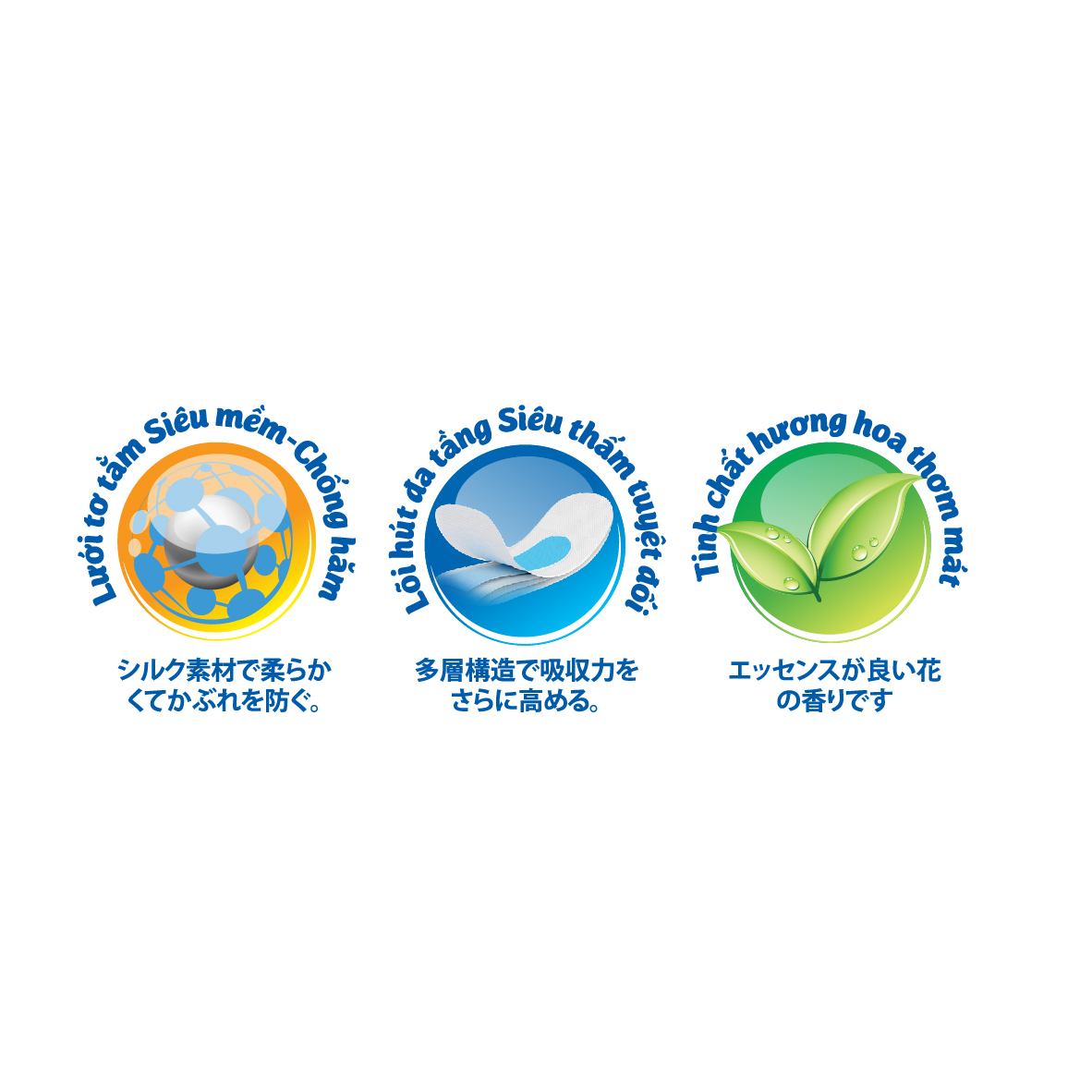 - Thành phần: Vải không dệt, hạt siêu hút nước (SAP), bông cellulose, chun sợi, màng PE, polyme kết dính, giấy không dính, Nano bạc (Ag+)