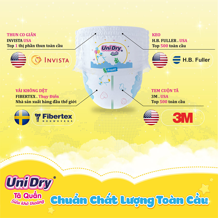 ĐỘC QUYỀN khi mua ONLINE - Tã quần UniDry SIÊU KHÔ THOÁNG cải tiến mới – Diện mạo mới , tăng cường thấm hút đến 20%, mỏng mềm hơn, bé mặc cưng – mẹ thêm ưng. TĂNG THẤM HÚT ĐẾN 20% Tăng cường khả năng thấm hút đến 20%, cho mông xinh luôn khô thoáng – thoải mái. BỀ MẶT ÊM MỀM HƠN Bề mặt tã siêu êm mềm, với cấu trúc 3D thoáng khí, nâng niu làn da mỏng manh của bé. MỎNG HƠN Tã mỏng hơn, bé thoải mái hơn. MÀNG ĐÁY THÔNG GIÓ Màng đáy thông thoáng cả ngày, bé tự do vận động. VẠCH BÁO TÃ ĐẦY Vạch báo tã đầy thông minh, nhắc mẹ biết ngay thời điểm thay tã. ĐẠT CÁC TIÊU CHUẨN QUỐC TẾ