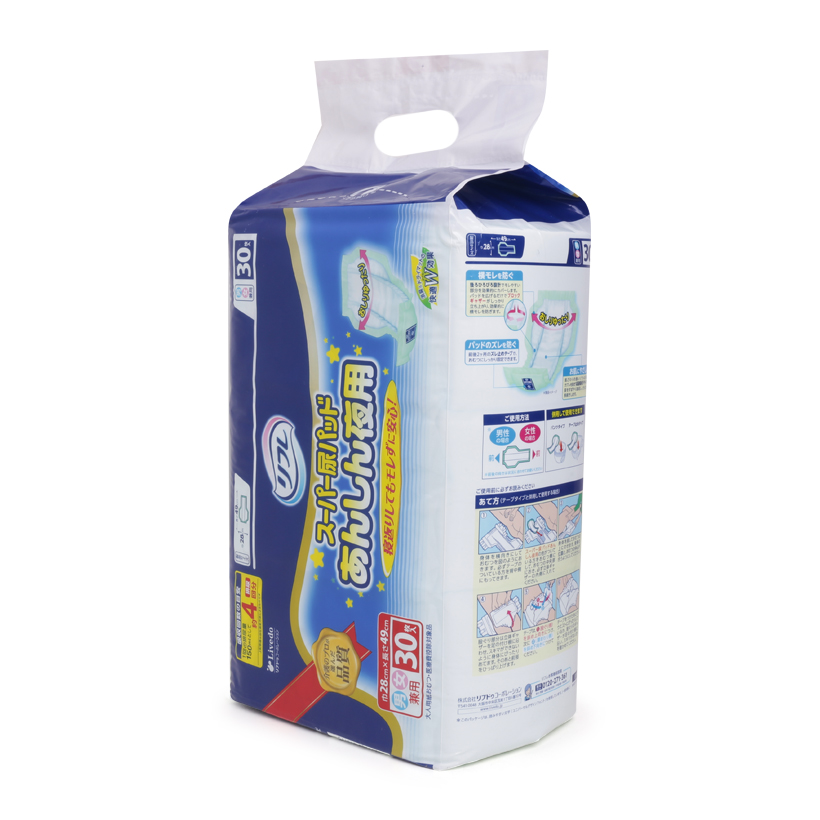 - Dùng cho ban đêm, phù hợp cho cả tã dán và tã quần Thành phần: Polyethylene, Poly-urethane spandex, Hook and loop, Nonwoven fabrics, Tissue, Pulp, Sap, Hot melt glue. Thông số kỹ thuật