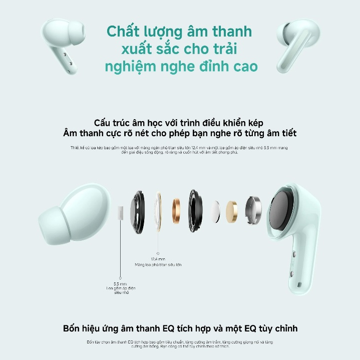 Redmi Buds 6 sử dụng kiến trúc âm thanh kép hàng đầu, có nghĩa là nó có thể cung cấp âm bổng rõ ràng và trong trẻo hơn cũng như âm trầm phong phú hơn. Cụ