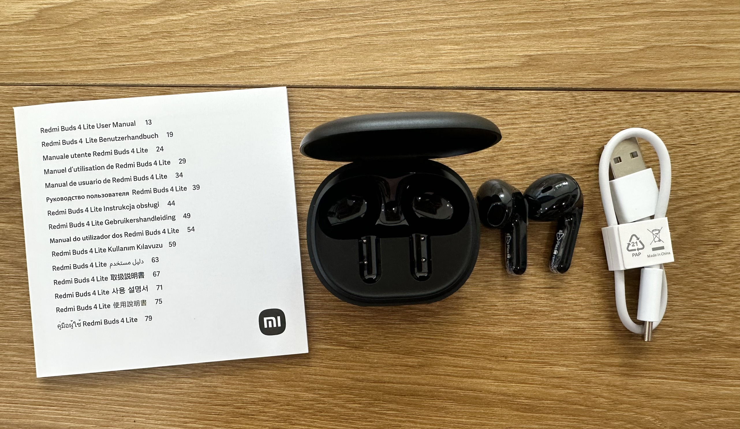 - Thao tác điều khiển: Chuyển bài, Điều chỉnh âm lượng, Trả lời cuộc gọi, Chuyển đổi giữa các chế độ khác nhau Sản phẩm bao gồm: Tai nghe và hộp sạc, Cáp sạc Type-C, Sách hướng dẫn