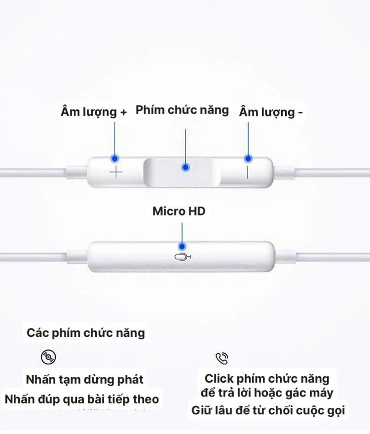 TÍNH NĂNG NỔI BẬT - Có remote nghe cuộc gọi hoặc tạm dừng khi đang nghe nhạc - Chân kết nối 3.5mm - Tính năng khử tiếng ồn - Chứng chỉ an toàn CE FCC