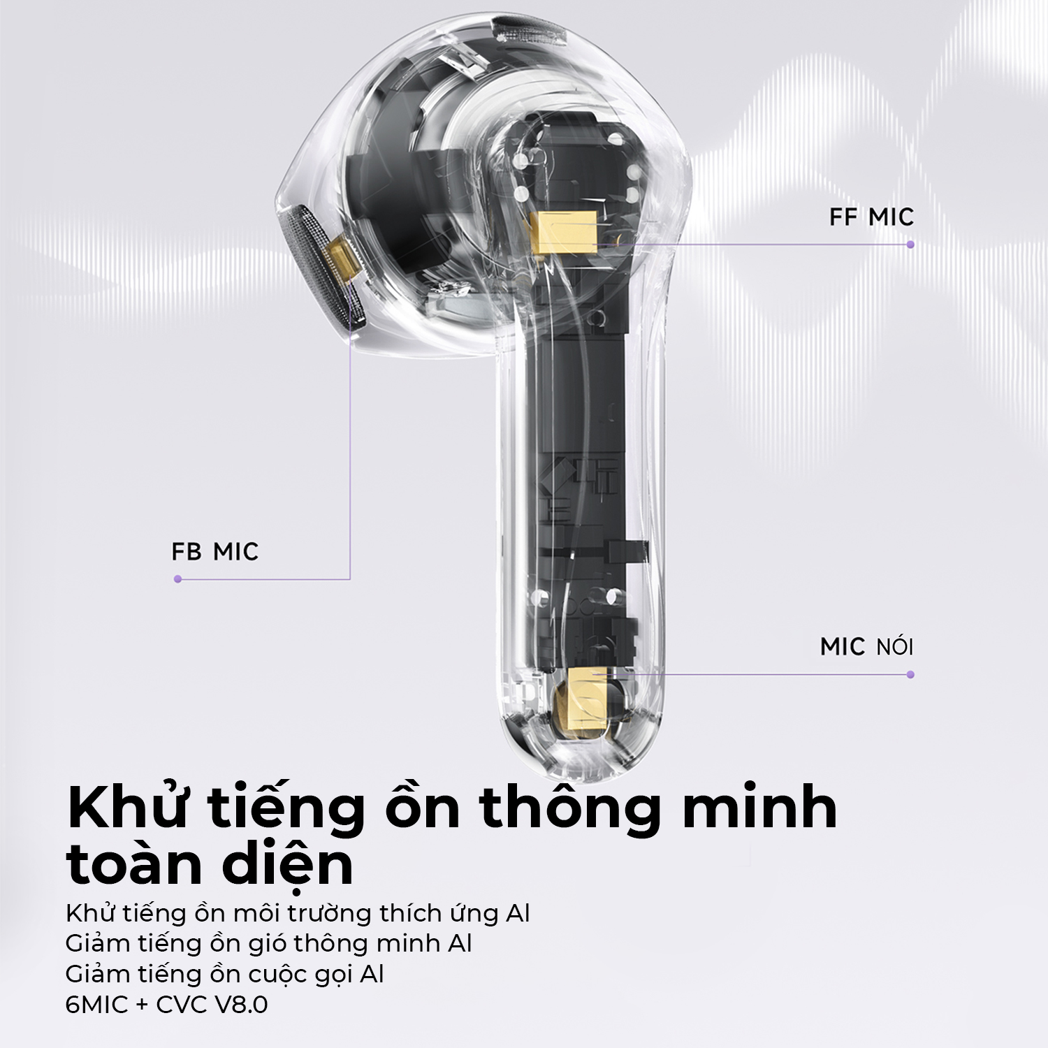 - Âm thanh sống động – Driver 10mm mang đến âm bass sâu, chi tiết rõ ràng - Bluetooth 5.3 – Kết nối ổn định, phản hồi nhanh, tiết kiệm pin - Mic kép AI