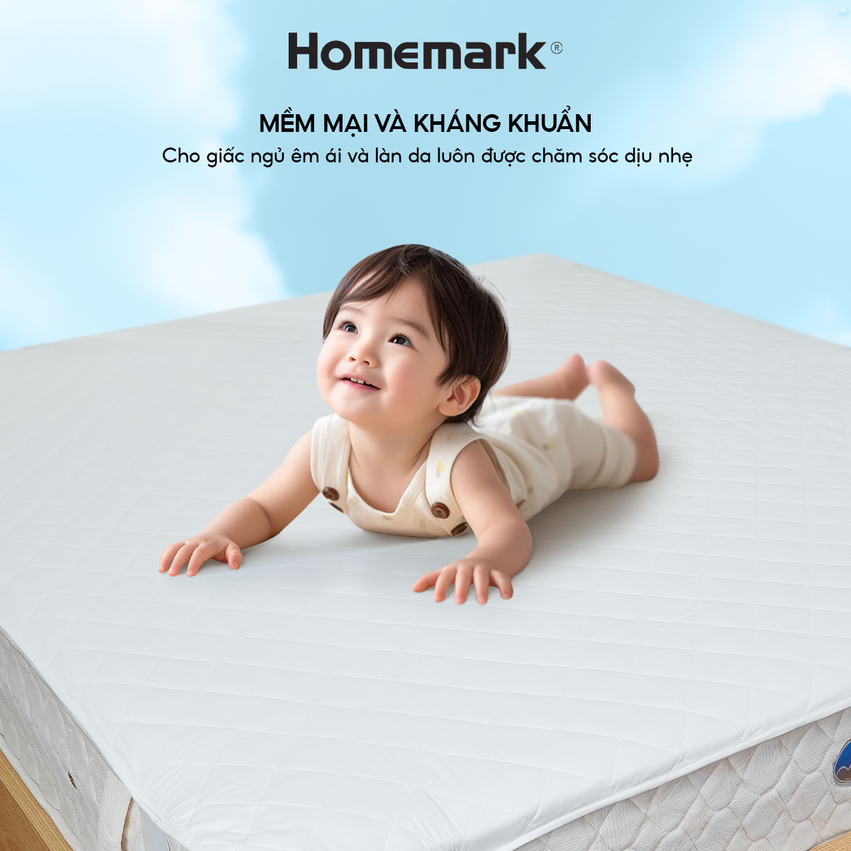 Tấm bảo vệ nệm chống thấm nước Homemark – 4 lớp bảo vệ tuyệt đối cho mọi loại nệm   Tấm bảo vệ nệm Homemark được thiết kế với 4 lớp chất liệu cao cấp, mang đến khả năng chống thấm hoàn hảo, giúp bảo vệ nệm của bạn khỏi nước, bụi bẩn và vi khuẩn. Với thiết kế thông minh, sản phẩm phù hợp với mọi loại nệm, mang lại sự thoải mái và an toàn cho giấc ngủ của bạn.   • Lớp 1 (Mặt trên cùng): Chất liệu vải chải brushed cotton mềm mại, êm ái, thấm hút mồ hôi tốt, mang lại cảm giác dễ chịu và thoáng mát khi sử dụng. • Lớp 2: Chèn bông microfiber 100% 3D mật độ 150gsm giúp tăng độ êm ái và nâng đỡ tốt hơn, đồng thời giữ cho nệm luôn khô ráo. • Lớp 3: Vải không dệt, thoáng khí, giúp bảo vệ nệm khỏi bụi bẩn và vi khuẩn mà vẫn đảm bảo độ bền lâu dài. • Lớp 4 (Lớp dưới cùng): Vải TPU chống thấm cao cấp, đảm bảo khả năng chống thấm 100%, giữ cho nệm luôn khô ráo, sạch sẽ.   Kích thước:   • 160x200 cm • 180x200 cm Phù hợp với nệm có độ cao từ 5-35 cm, dễ dàng sử dụng cho nhiều loại nệm khác nhau.   Thiết kế tiện lợi:   • Dây chun 4 góc với bản rộng 5cm chắc chắn, giúp giữ tấm bảo vệ luôn cố định trên nệm mà không bị xô lệch trong quá trình sử dụng.   Hướng dẫn sử dụng:
