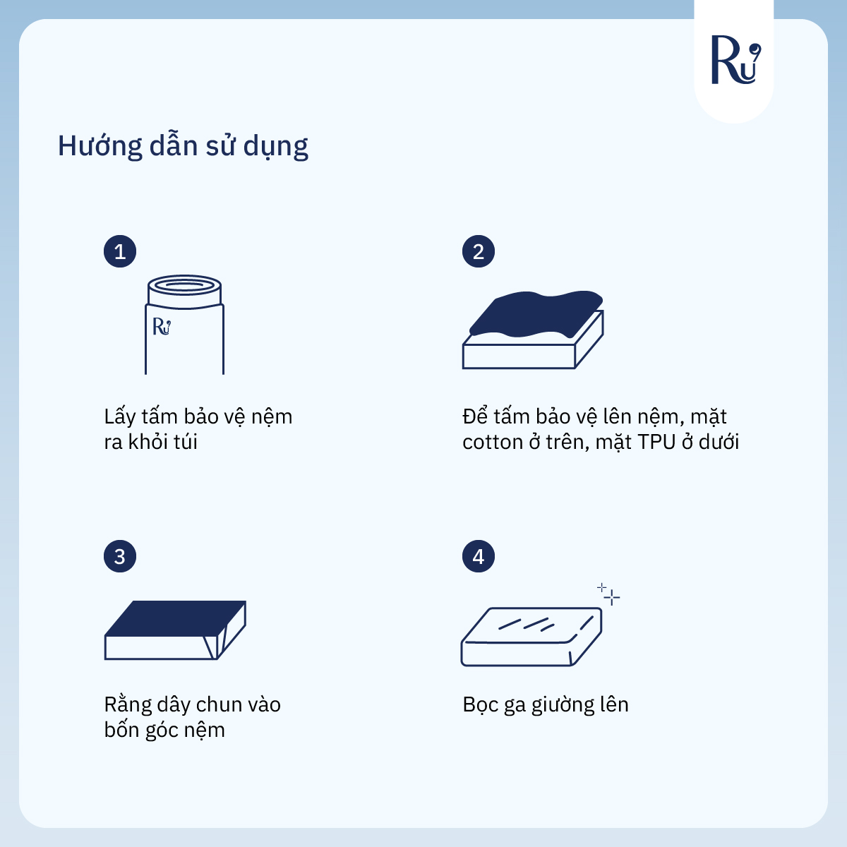 *Hướng dẫn sử dụng: - Khi sử dụng, gỡ dây cột túi tấm bảo vệ và lấy tấm bảo vệ ra - Có thể cuộn lại và bỏ vào túi để giữ vệ sinh nếu không sử dụng - Để ở trên mặt nệm và ở dưới ga giường