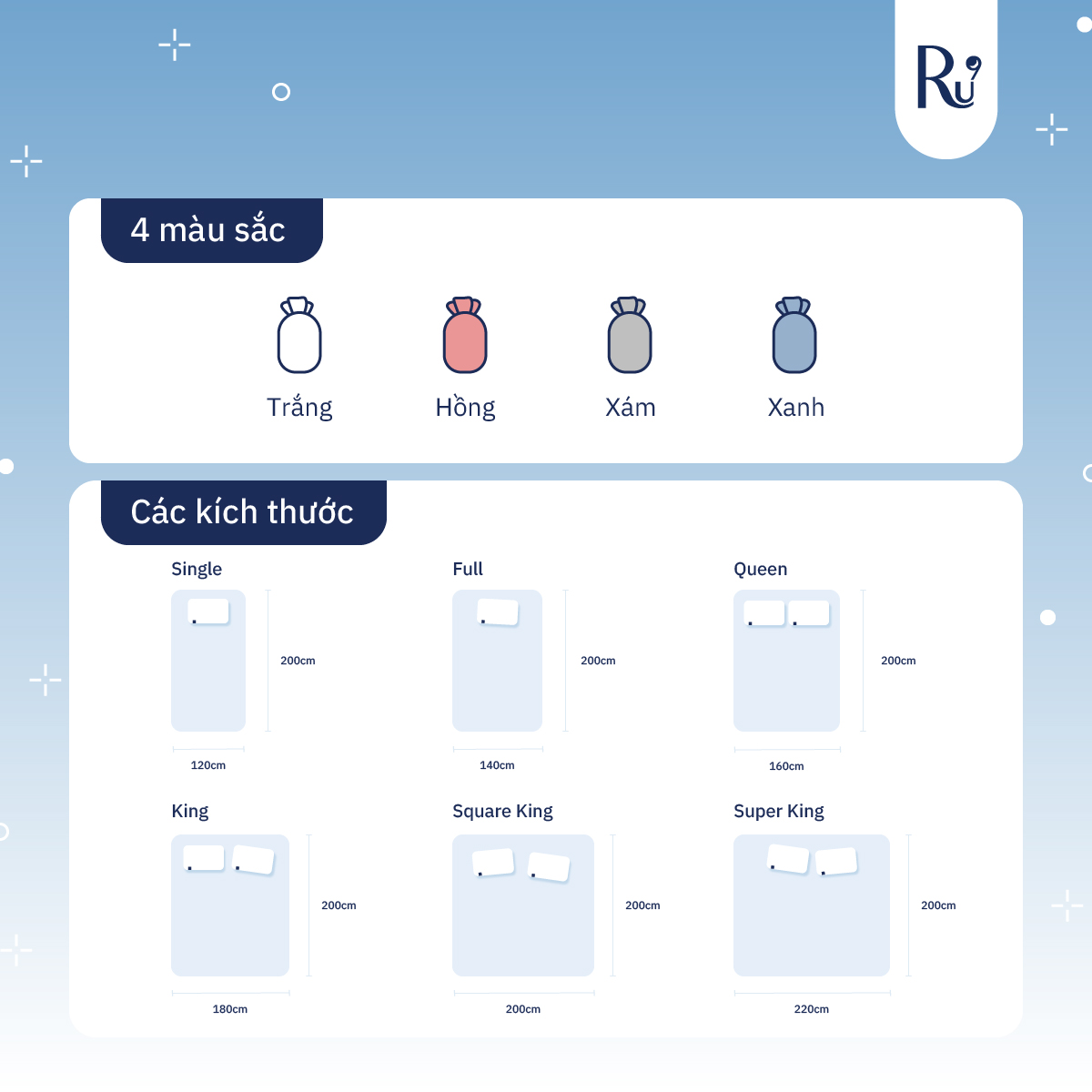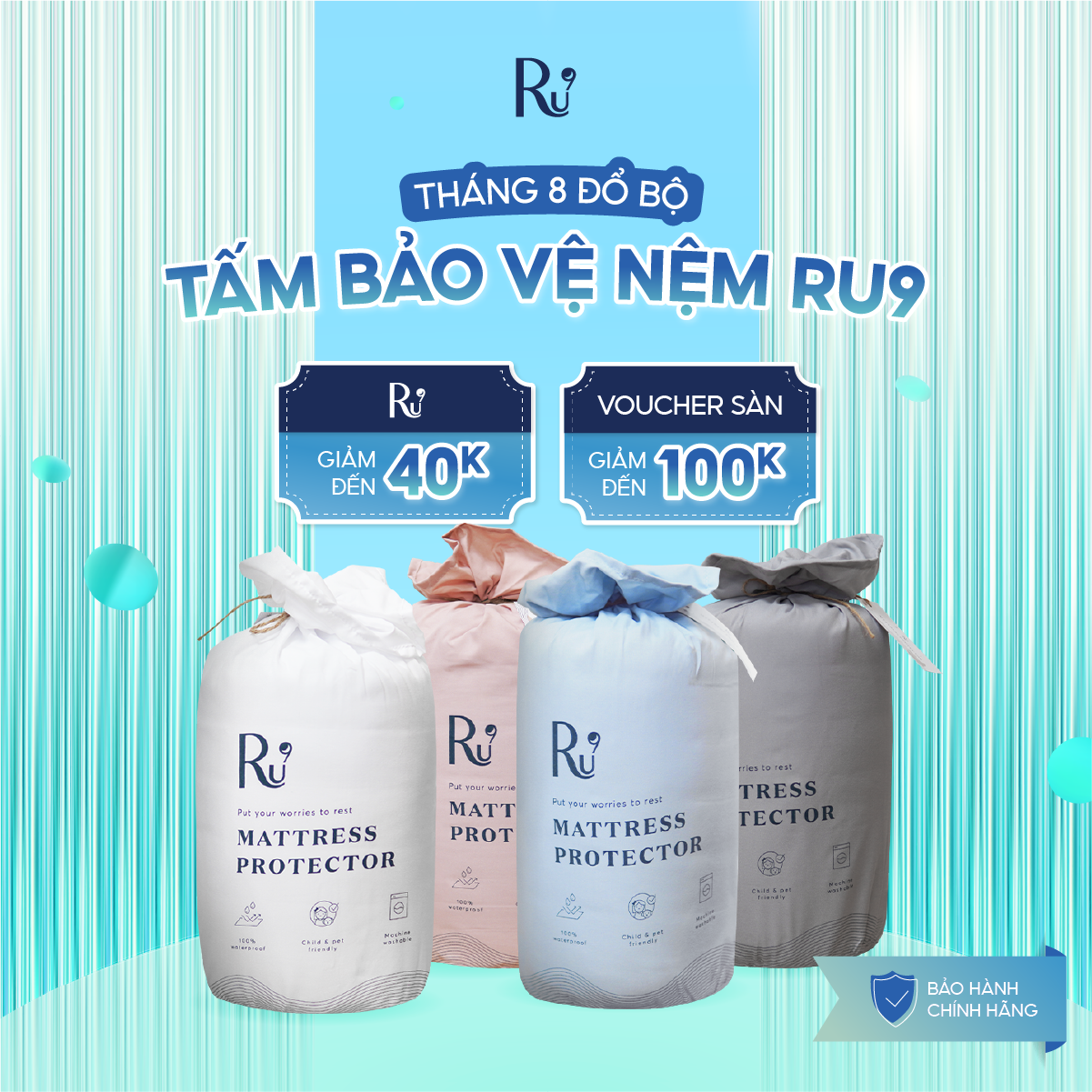 Tấm Bảo Vệ Nệm (Mattress Protector) Ru9 Chống Thấm Tuyệt Đối, Thông Thoáng - Mềm Mại | 6 Kích Thước | Nhiều Màu Sắc ---------------------------------------------------- *Chi tiết sản phẩm: Thông tin sản phẩm: Tấm Bảo Vệ Nệm Ru9 vừa hỗ trợ giữ chiếc nệm luôn sạch sẽ, vừa đảm bảo đem đến sự êm ái, dễ chịu cho giấc ngủ của bạn. Không chỉ ngăn cản làm bẩn nệm, “tấm khiên” này còn bảo vệ bạn khỏi sự lo lắng không đáng có. - Quy cách đóng gói: Sản phẩm được cuộn lại và bỏ vào túi vải nhỏ gọn và tiện lợi - Sản phẩm gồm: 1 tấm bảo vệ Ru9 và túi để đựng ---------------------------------------------------- *Hướng dẫn bảo quản: - Giặt tấm bảo vệ định kì với máy giặt để giữ vệ sinh. - Giặt ở chế độ giặt nhẹ, không sấy nóng. ---------------------------------------------------- *Hướng dẫn sử dụng: - Khi sử dụng, gỡ dây cột túi tấm bảo vệ và lấy tấm bảo vệ ra - Có thể cuộn lại và bỏ vào túi để giữ vệ sinh nếu không sử dụng - Để ở trên mặt nệm và ở dưới ga giường ---------------------------------------------------- *Lưu ý: - Tránh tiếp xúc trực tiếp với nắng gắt ---------------------------------------------------- *Cam kết với khách hàng: Miễn phí vận chuyển với đơn hàng trên 1.500.000đ ---------------------------------------------------- *Chính sách giao hàng: Giao tiêu chuẩn (trừ Chủ Nhật): - Hồ Chí Minh và Hà Nội (2 ngày) - Tỉnh (4 - 5 ngày) - Khu vực cận HCM và HN (2-3 ngày) Cần thêm thông tin và hỗ trợ