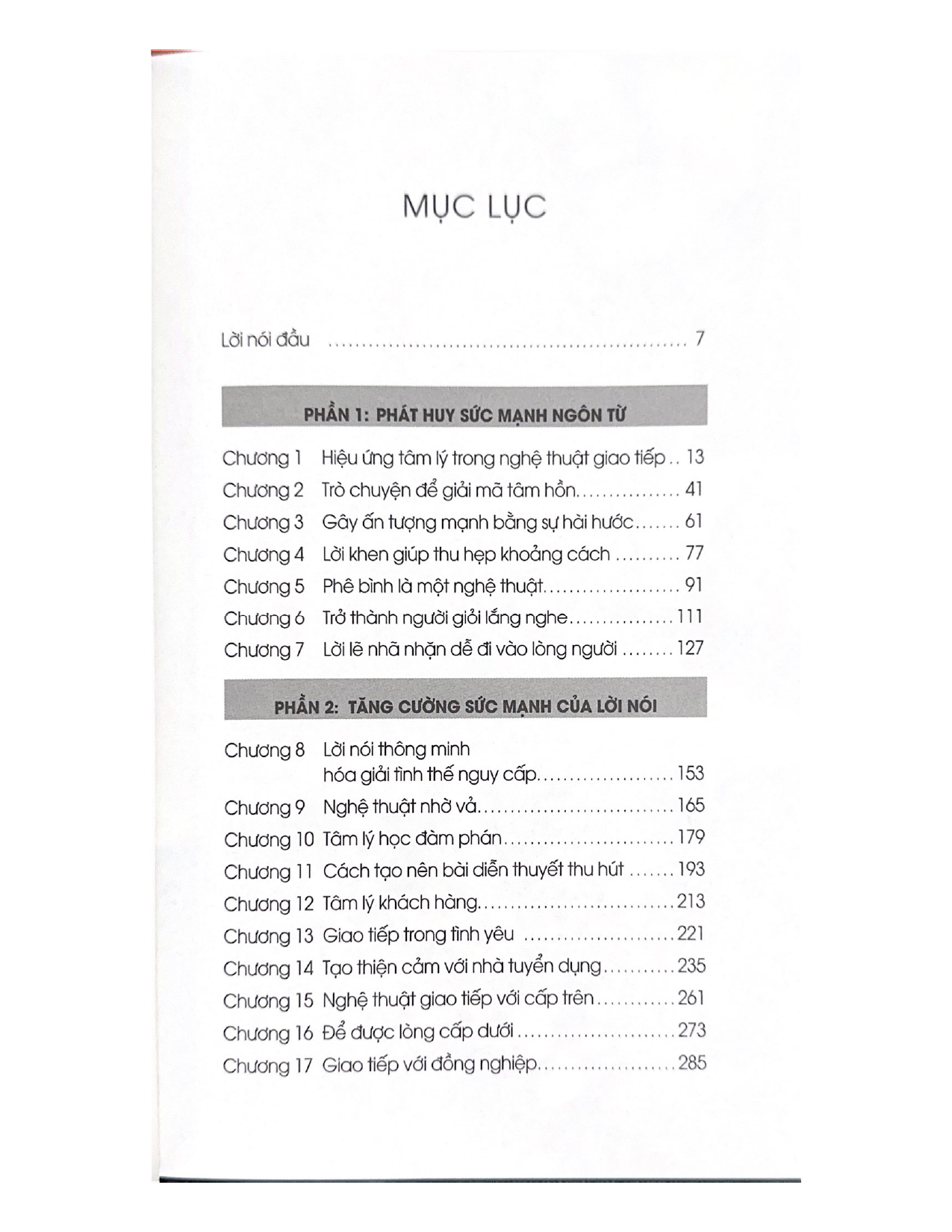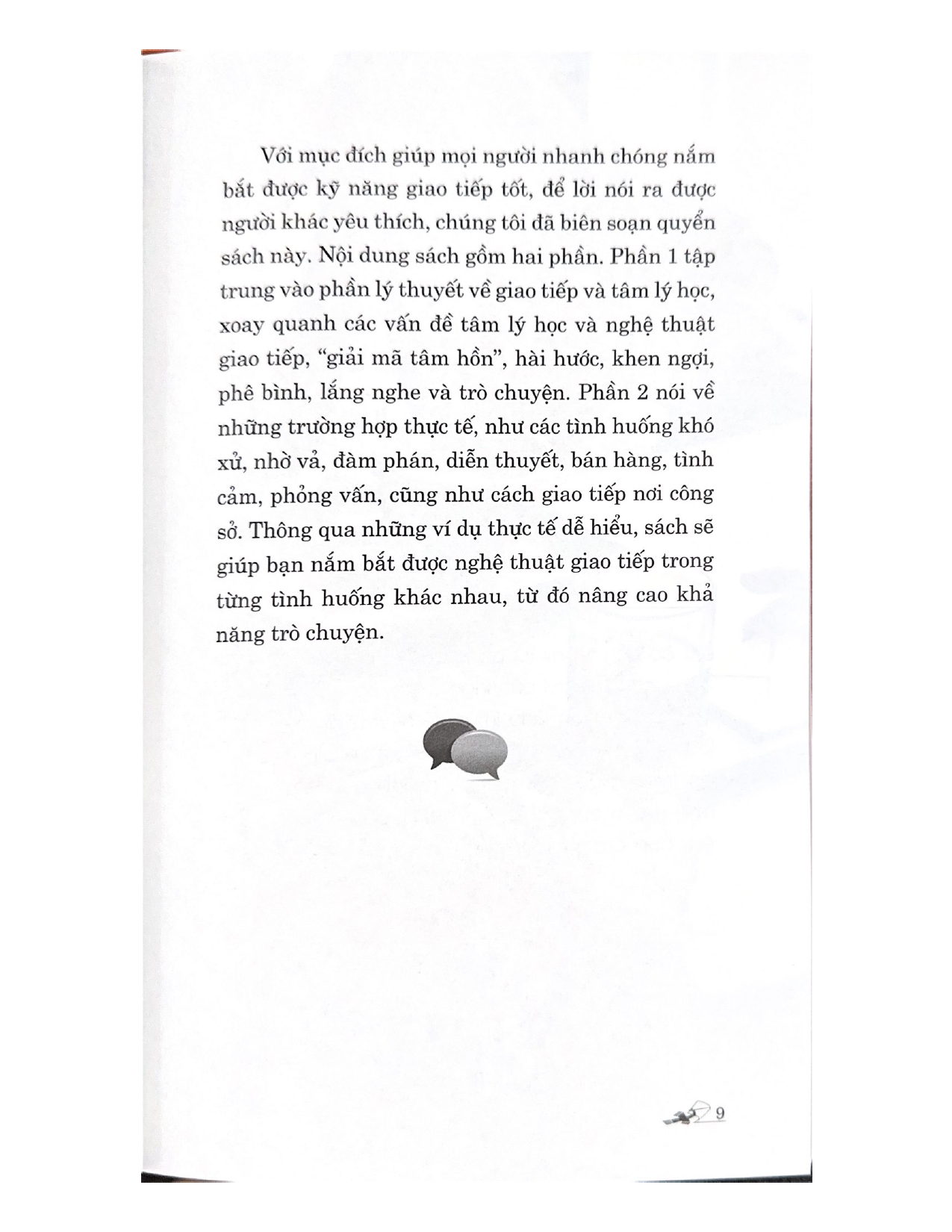 - Giới thiệu Tâm Lý Học Giao Tiếp Trong đời người, từ xin việc cho đến thăng chức, từ xã giao cho đến kết bạn, từ trò chuyện cho đến thuyết phục, tất cả đều cần đến khả năng ăn nói. Do đó, người nắm bắt được kỹ năng giao tiếp cũng giống như có được con át chủ bài của sự thành công. “Tâm lý học giao tiếp” tập trung phân tích các hiệu ứng tâm lý và các bí quyết giao tiếp, giải mã tâm hồn đối phương. Đồng thời giúp bạn vận dụng lý thuyết tâm lý học vào những trường hợp giao tiếp thực tế trong cuộc sống. Cách giải quyết các tình huống khó xử, cách nhờ vả, đàm phán, diễn thuyết, bán hàng, phỏng vấn, cách ứng xử với lãnh đạo, cấp dưới, đồng nghiệp và cả người yêu, đều sẽ được lý giải trong từng ví dụ cụ thể.