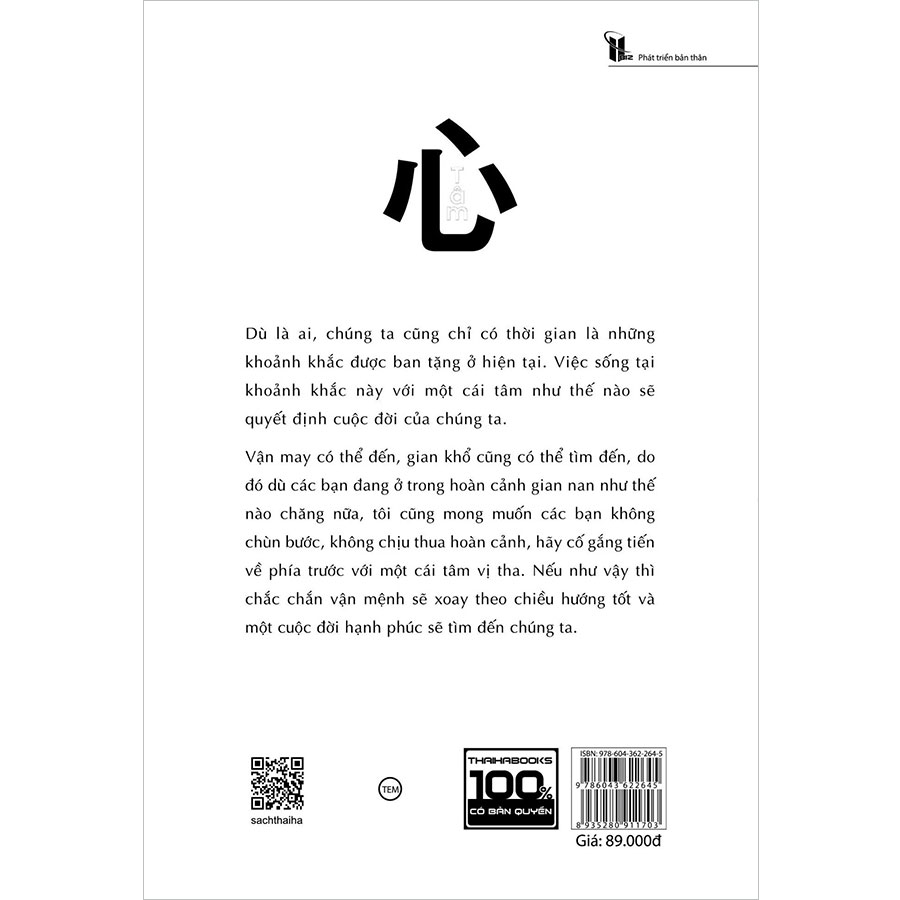 Dù là ai, chúng ta cũng chỉ có thời gian là những khoảnh khắc được ban tặng ở hiện tại. Việc sống tại khoảnh khắc này với một cái tâm như thế nào sẽ quyết định cuộc đời của chúng ta. Vận may có thể đến, gian khổ cũng có thể tìm đến, do đó dù các bạn đang ở trong hoàn cảnh gian nan như thế nào chăng nữa, tôi cũng mong muốn các bạn không chùn bước, không chịu thua hoàn cảnh, hãy cố gắng tiến về phía trước với một cái tâm vị tha. Nếu như vậy thì chắc chắn vận mệnh sẽ xoay theo chiều hướng tốt và một cuộc đời hạnh phúc sẽ tìm đến chúng ta. Nếu có thể nghĩ như vậy thì cuộc đời vô cùng đơn giản. Trong cuộc sống hàng ngày, nếu chúng ta cứ nỗ lực hết mình với một cái tâm vị tha thì chắc chắn vận mệnh sẽ xoay theo chiều hướng tốt và một cuộc đời hạnh phúc sẽ tìm đến. Và điều quan trọng là tại bất cứ thời điểm nào chúng ta cũng cố gắng gìn giữ một cái tâm đẹp và thuần khiết. Đó là bí quyết để chúng ta có thể phát huy khả năng của bản thân, là chìa khóa giúp chúng ta mở được cánh cửa của một cuộc đời hạnh phúc. Thông tin tác giả Inamori Kazuo (sinh năm 1932) là một doanh nhân huyền thoại của Nhật Bản. Ông đã gây dựng nên Kyocera, một tập đoàn công nghệ cao đa quốc gia với hơn 66.000 nhân viên. Trong hai năm 2010-2012, Inamori Kazuo đã góp công lớn trong việc tái sinh hãng hàng không Japan Airlines, vốn đang trên bờ vực phá sản. Ông đã được một số trường đại học ở Nhật Bản, Mỹ và Anh trao bằng tiến sĩ danh dự cho các cống hiến trong kinh doanh và hoạt động xã hội.