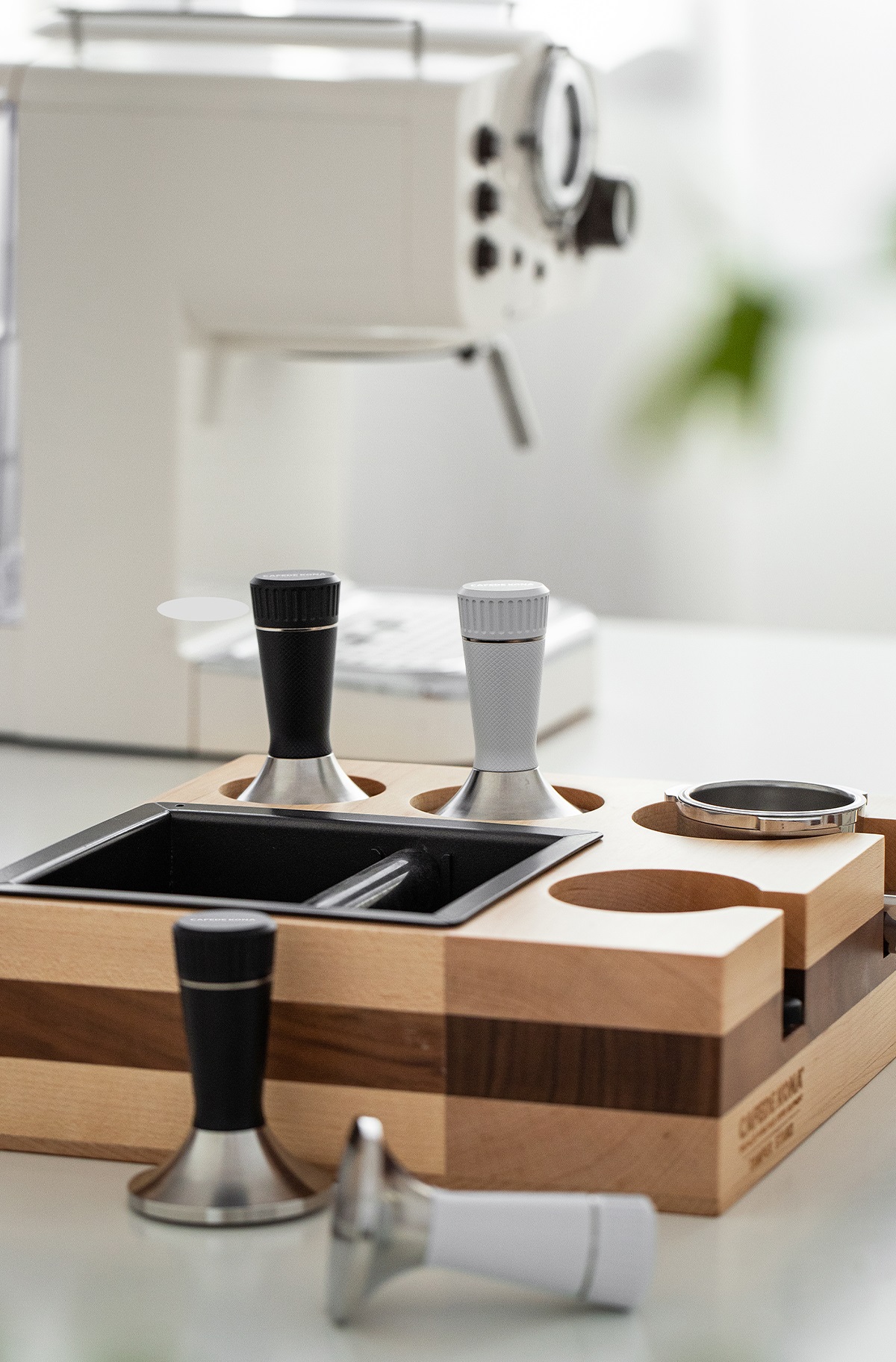 GIÁ ĐỠ TAMPER BẰNG GỖ TỰ NHIÊN PHA CÀ PHÊ MÁY ESPRESSO CAFE DE KONA Khối gỗ được làm bằng 2 loại gỗ: gỗ óc chó đen và gỗ giẻ gai châu âu.
