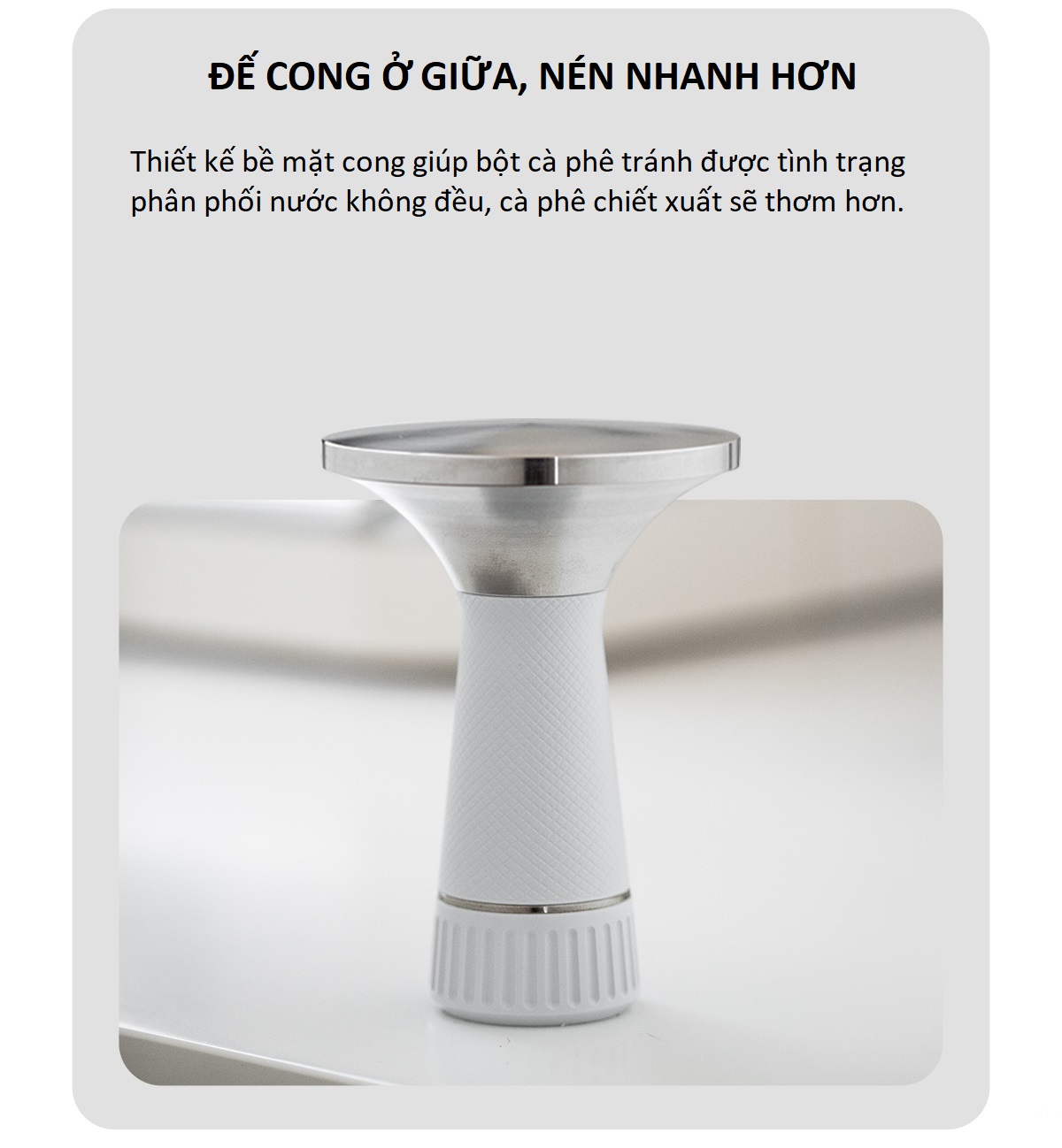 Thiết kế bề mặt nén cong giúp bột cà phê tránh được tình trạng phân phối nước không đều, cà phê chiết xuất sẽ thơm hơn.