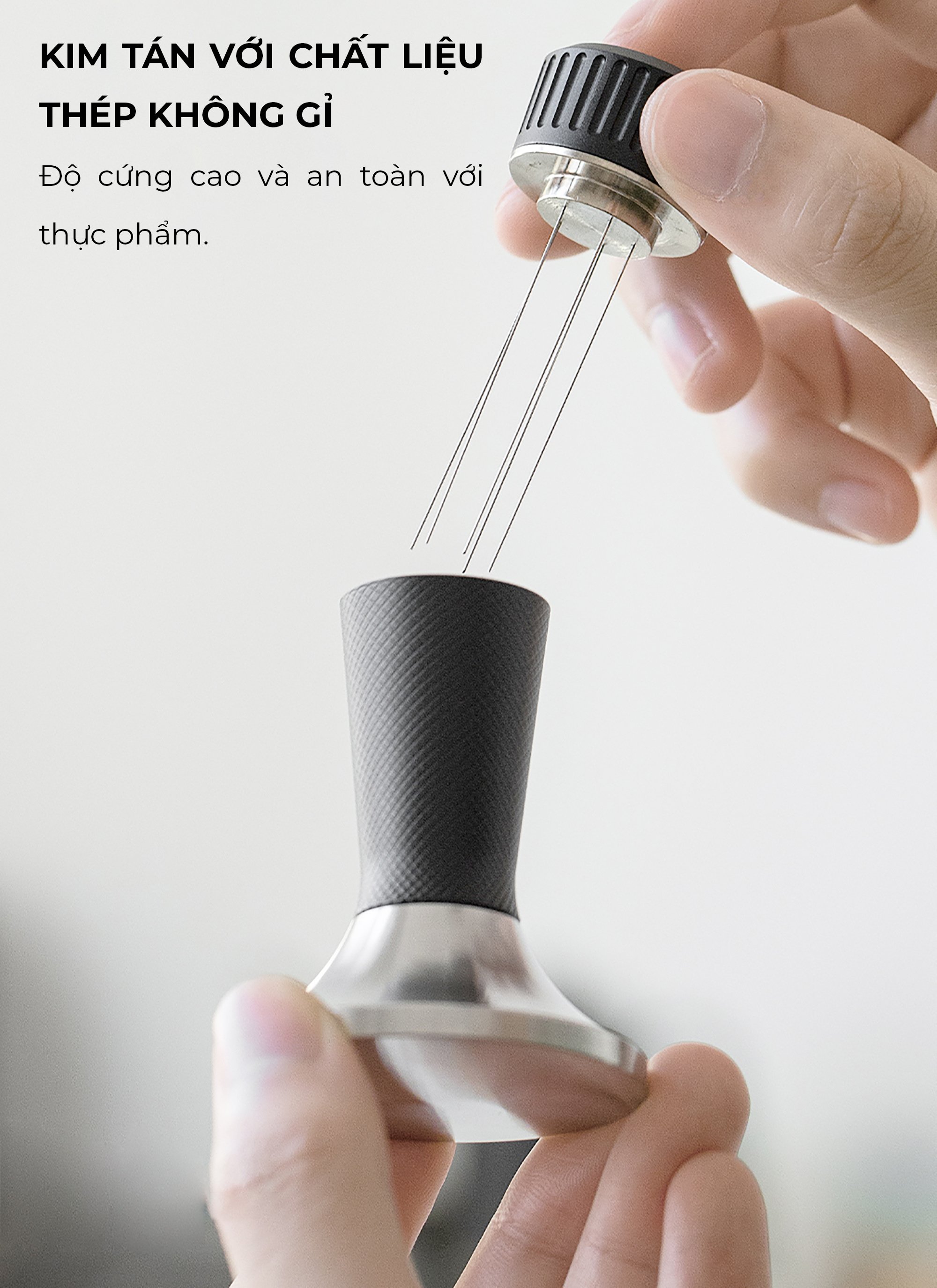 Kim tán với chất liệu thép không gỉ, độ cứng cao và an toàn với thực phẩm. Nhỏ gọn và tiện lợi, dễ dàng phân tán bột cà phê vón cục sau khi xay.