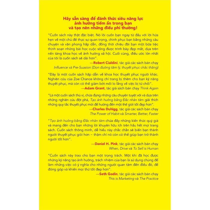 "Cuốn sách này trao cho bạn một trọng trách. Một khi đã học được những kỹ năng tạo ảnh hưởng, trách nhiệm của bạn là sử dụng chúng để làm những việc có ý nghĩa cho những người quan tâm đến điều đó, đề đóng góp và khiến mọi thứ tốt đẹp hơn”. - Seth Godin, tác giả các sách bán chạy This is Marketing và The Practice