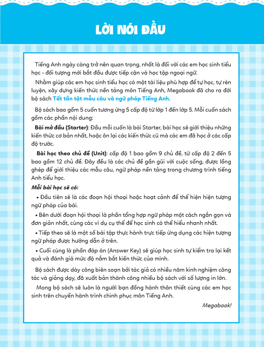 Tiếng Anh ngày càng trở nên quan trọng, nhất là đối với các em học sinh tiểu học - đối tượng mới bắt đầu được tiếp cận và học tập ngoại ngữ. Nhằm giúp các em học sinh tiểu học có một tài liệu phù hợp để tự học, tự rèn luyện, xây dựng kiến thức nền tảng môn Tiếng Anh, bộ sách Tất Tần Tật Mẫu Câu Và Ngữ Pháp Tiếng Anh đã ra đời.