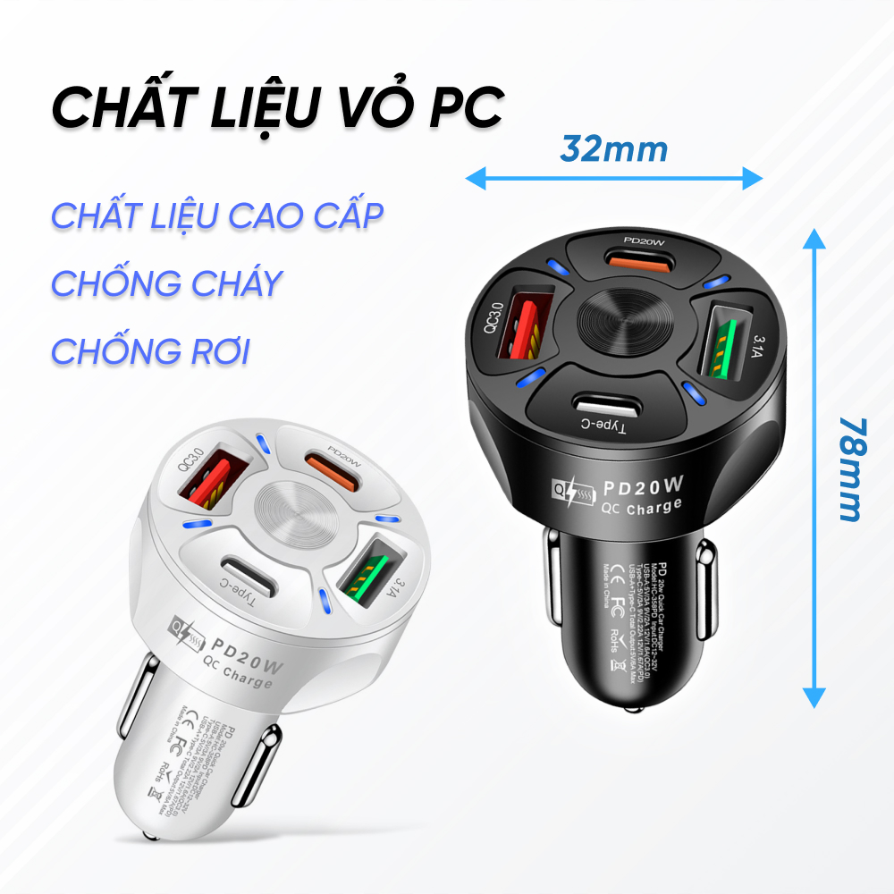 ✨Tẩu Sạc Điện Thoại USB Type C Hỗ Trợ Sạc Nhanh 20W | Tẩu Sạc Điện Thoại 4 Cổng Sạc Tương Thích Với Nhiều Thiết Bị, Có Công Nghệ Sạc Nhanh QC 3.0 PD 20W