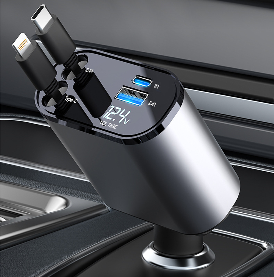 Tẩu Sạc Nhanh Xe Ô Tô TÍCH HỢP DÂY Sạc Type C, Lightning 100W | Hiển Thị Thông Số Sạc, Dây Rút Chống Rối, 4in1 Thuận tiện: Bộ sạc ô tô USB này có thiết kế nhỏ gọn, nâng cao vẻ ngoài của nội thất ô tô của bạn. Nói lời tạm biệt với những sợi dây lộn xộn và tận hưởng vẻ ngoài sạch sẽ, gọn gàng hơn khi sạc các thiết bị của bạn ở ngoài.    Sạc nhanh: Bộ sạc có thể sạc đồng thời 4 thiết bị với tốc độ nhanh, với công suất tối đa 2,4A/12W cho mỗi cổng. Tổng công suất 4,8A đảm bảo sạc hiệu quả cho cả điện thoại và máy tính bảng.    Quản lý cáp theo phong cách: Giữ cho ô tô của bạn sạch sẽ và gọn gàng với hệ thống cáp có thể thu vào. Cáp không vướng víu kéo dài trơn tru lên đến 80cm và tự động thu trở lại. Thiết kế linh hoạt của nó có thể mở rộng để dễ dàng đáp ứng mọi yêu cầu sạc của bạn.    An toàn: hỗ trợ sạc nhanh giao thức đầy đủ cho các nhãn hiệu thiết bị khác nhau. Nó có thể sạc các thiết bị của bạn một cách nhanh chóng và hiệu quả để đáp ứng nhu cầu hàng ngày của bạn.    Khả năng tương thích phổ quát: Bộ sạc ô tô USB đa năng này hoàn hảo cho nhiều kiểu xe, từ ô tô nhỏ đến xe tải và SUV, đồng thời tương thích với các kiểu xe phổ thông có điện áp lái xe từ 12V đến 24V, đảm bảo khả năng tương thích với nhiều loại xe.  Trải nghiệm khả năng sạc nhanh như chớp khi đang di chuyển với bộ sạc nhỏ gọn dành cho ô tô và xe tải này. Nó tự động rút lại để tạo sự thuận tiện tối đa và có thể cung cấp một giao thức sạc nhanh đầy đủ với công suất tối đa lên đến 2.4A/12W. Nói lời tạm biệt với pin chết trên đường!   Thông số kỹ thuật: Chất liệu: ABS + PC Màu sắc: bạc Trọng lượng: khoảng 100g Điện áp: 10-30V Đầu ra: tối đa 100W Kích thước: khoảng 139 65 34,5mm Chiều dài mở rộng cáp sạc: 800 +/- 30mm