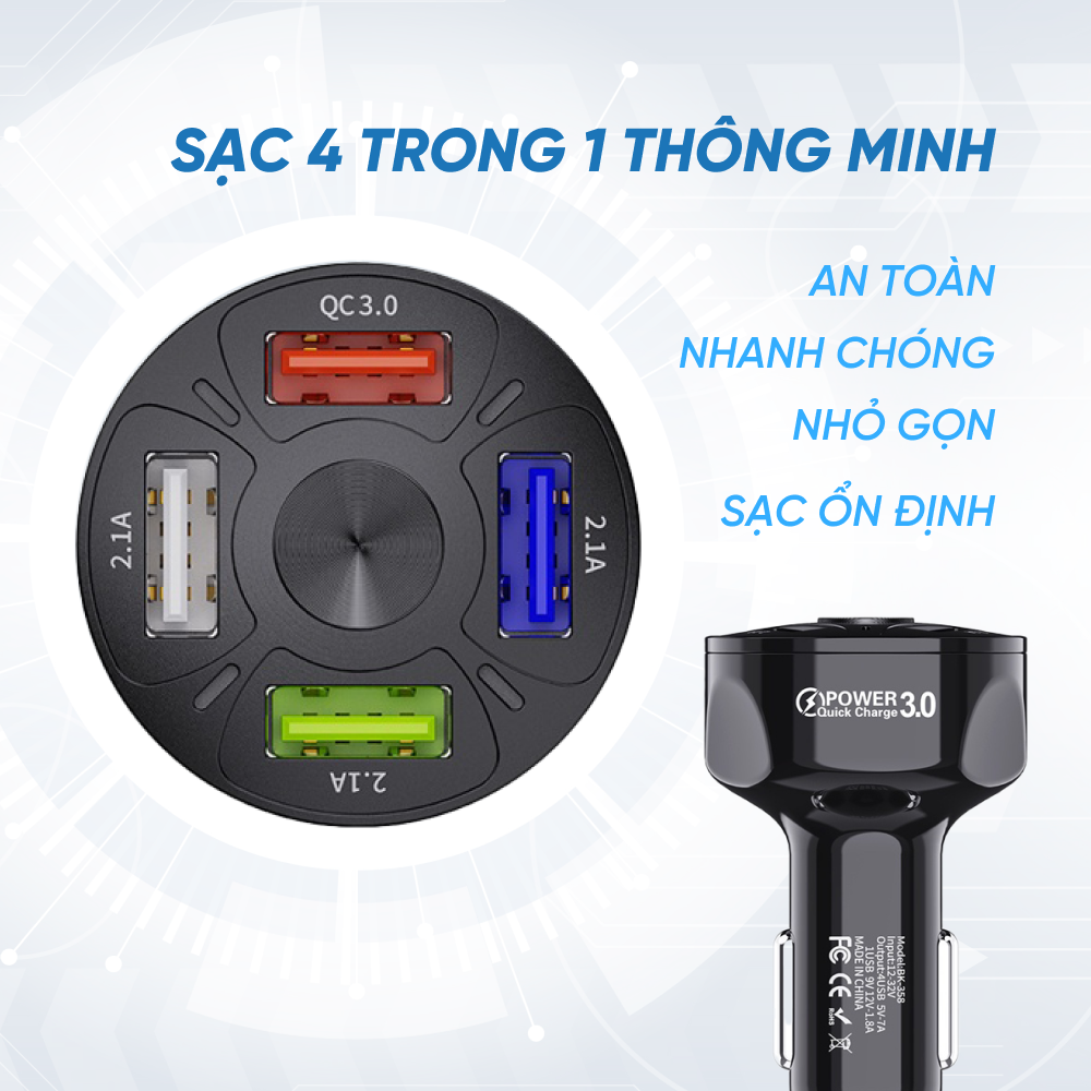 Tẩu Sạc Xe Ô Tô 4 Cổng USB Công Nghệ Sạc Nhanh QC 3.0A THÔNG TIN SẢN PHẨM: