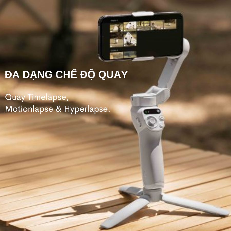 - Timelapse: Cho phép bạn chỉ cần đặt máy xuống và quay. Trong khi bạn đang tận hưởng khoảng thời gian của riêng mình thì chiếc gimbal đã tạo ra những thước phim đầy chất lượng.