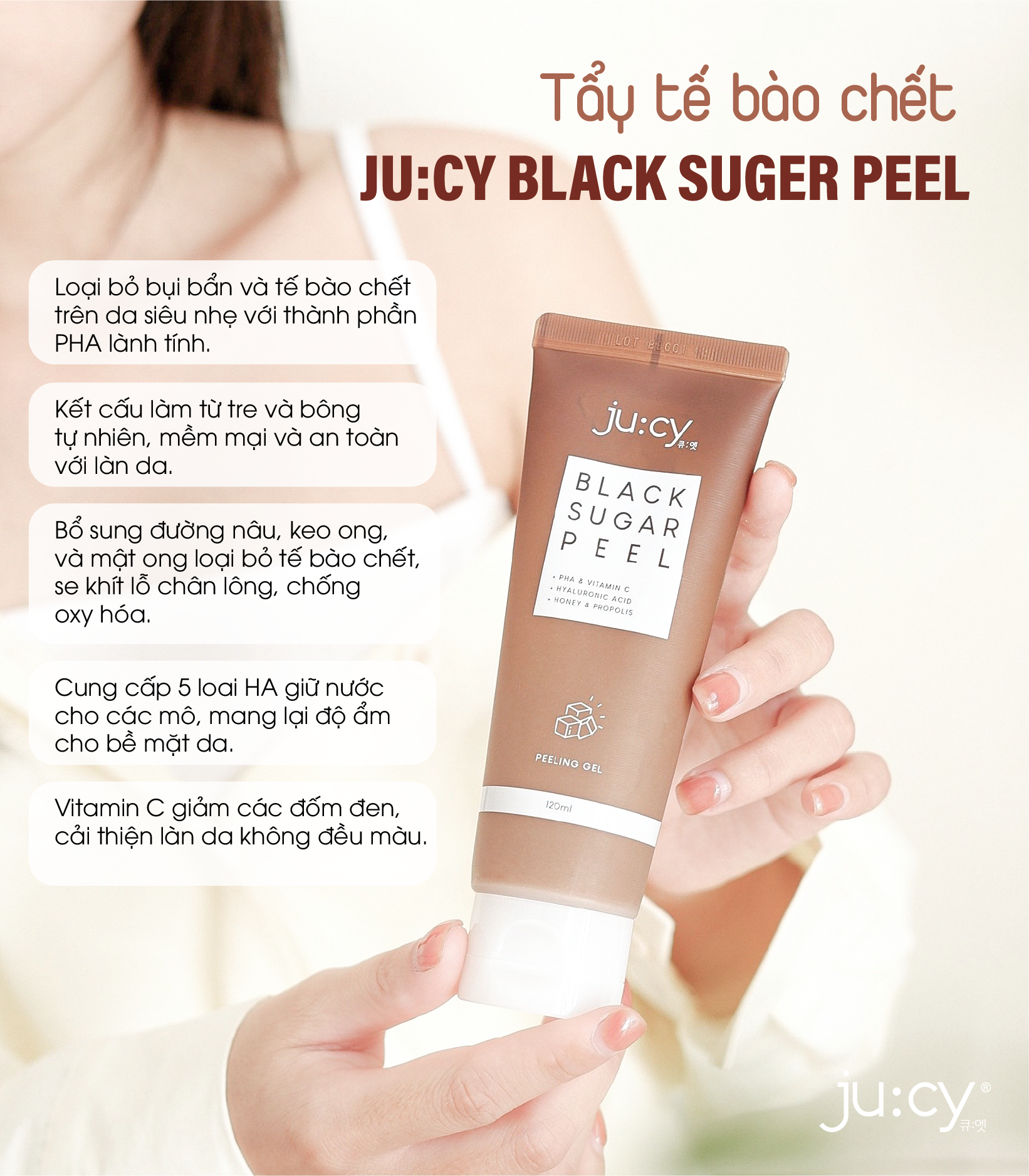 Tẩy tế bào chết đường nâu Jucy Black Sugar Peel 120ml là sản phẩm chăm sóc da với thành phần PHA lành tính, giúp loại bỏ tế bào da cũ một cách nhẹ nhàng mà