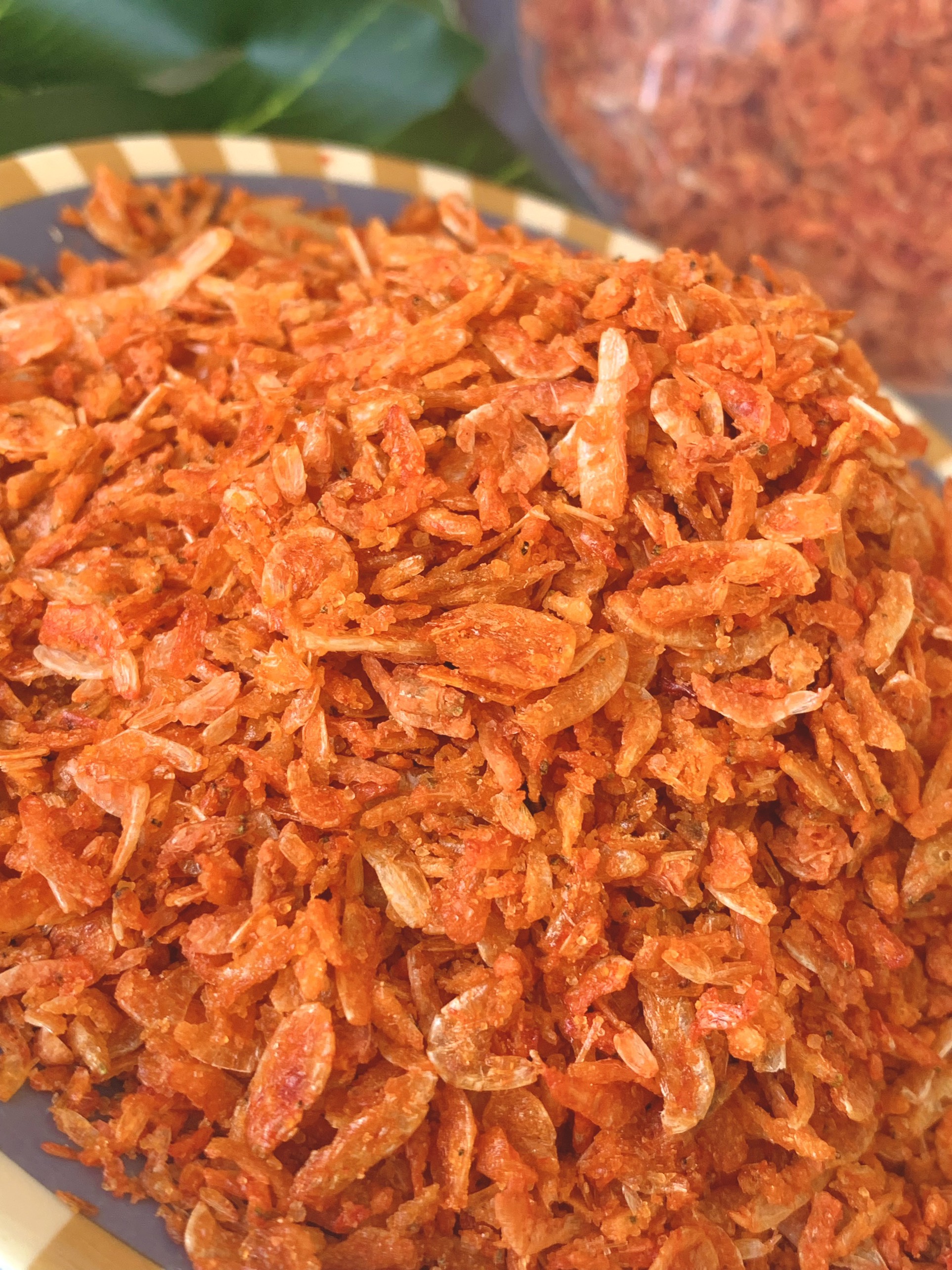 Thành phần: 95% tép khô, đường cát, muối I-ốt, chất điều vị E621, phẩm màu được phép dùng trong thực phẩm E110,