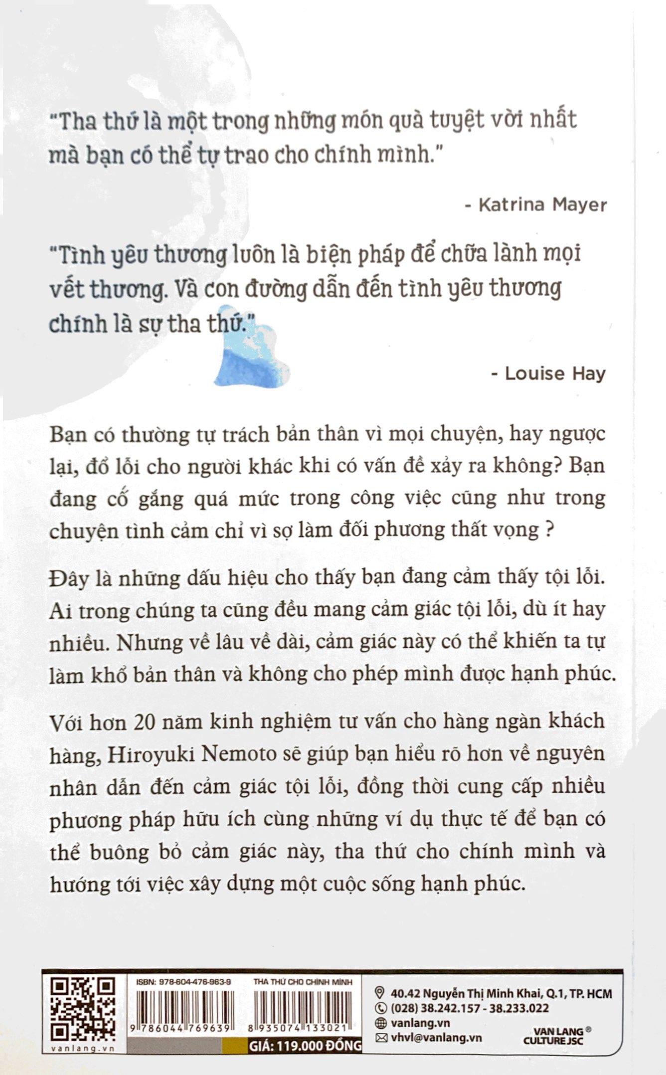 - Louise Hay Bạn có thường tự trách bản thân vì mọi chuyện, hay ngược lại, đổ lỗi cho người khác khi có vấn đề xảy ra không? Bạn đang cố gắng quá mức trong công việc cũng như trong chuyện tình cảm chỉ vì sợ làm đối phương thất vọng ? Đây là những dấu hiệu cho thấy bạn đang cảm thấy tội lỗi. Ai trong chúng ta cũng đều mang cảm giác tội lỗi, dù ít hay nhiều. Nhưng về lâu về dài, cảm giác này có thể khiến ta tự làm khổ bản thân và không cho phép m.ình được hạnh phúc Với hơn 20 năm kinh nghiệm tư vấn cho hàng ngàn khách hàng, Hiroyuki Nemoto sẽ giúp bạn hiểu rõ hơn về nguyên nhân dẫn đến cảm giác tội lỗi, đồng thời cung cấp nhiều phương pháp hữu ích cùng những ví dụ thực tế để bạn có thể buông bỏ cảm giác này, tha thứ cho chính m.ình và hướng tới việc xây dựng một cuộc sống hạnh phúc