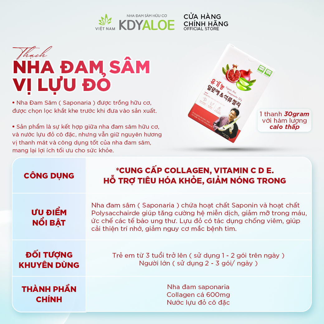 THẠCH COLLAGEN KDY ALOE NHA ĐAM SÂM LỰU ĐỎ LÀM ĐẸP DA Nha đam sâm chứa hoạt chất Polysaccharide, Saponin giúp Tăng miễn dịch, Hỗ trợ tiêu hóa, Giúp nhuận tràng, Giảm táo bón .