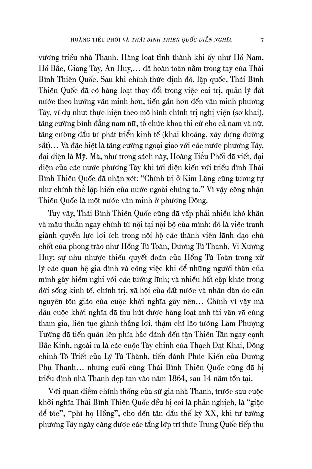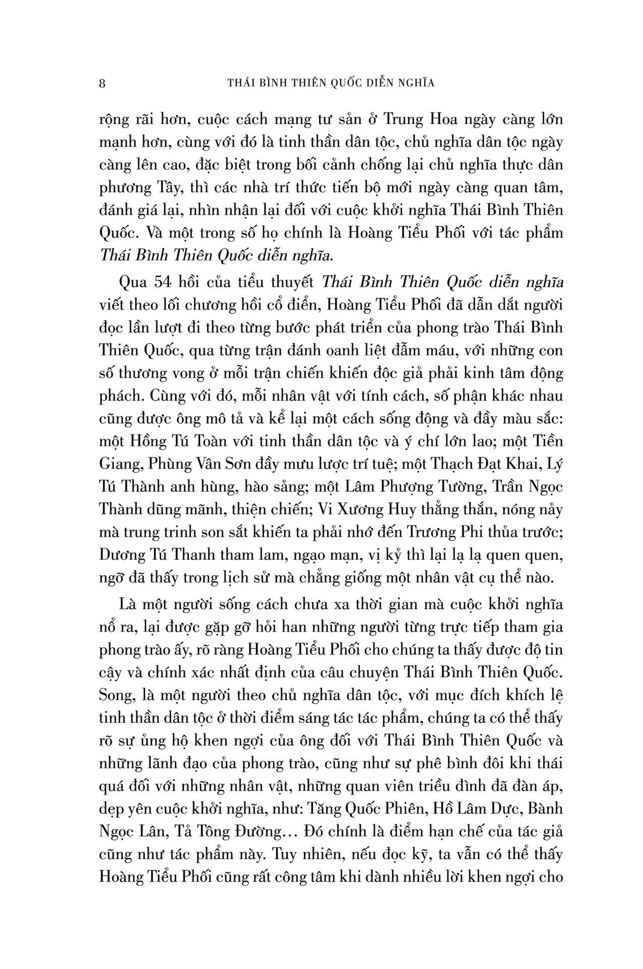 Qua 54 hồi của tiểu thuyết Thái Bình Thiên Quốc diễn nghĩa viết theo lối chương hồi cổ điển, Hoàng Tiểu Phối đã dẫn dắt người đọc lần lượt đi theo từng bước phát triển 14 năm của phong trào Thái Bình Thiên Quốc (1851 - 1864), qua từng trận đánh oanh liệt đẫm máu, với những con số thương vong ở mỗi trận chiến khiến độc giả phải kinh tâm động phách. Cùng với đó, mỗi nhân vật với tính cách, số phận khác nhau cũng được ông mô tả và kể lại một cách sống động và đầy màu sắc. Là một người sống cách chưa xa thời gian mà cuộc khởi nghĩa nổ ra, lại được gặp gỡ hỏi han những người trực tiếp tham gia phong trào ấy, rõ ràng Hoàng Tiểu Phối cho chúng ta thấy được độ tin cậy và chính xác nhất định của câu chuyện Thái Bình Thiên Quốc.