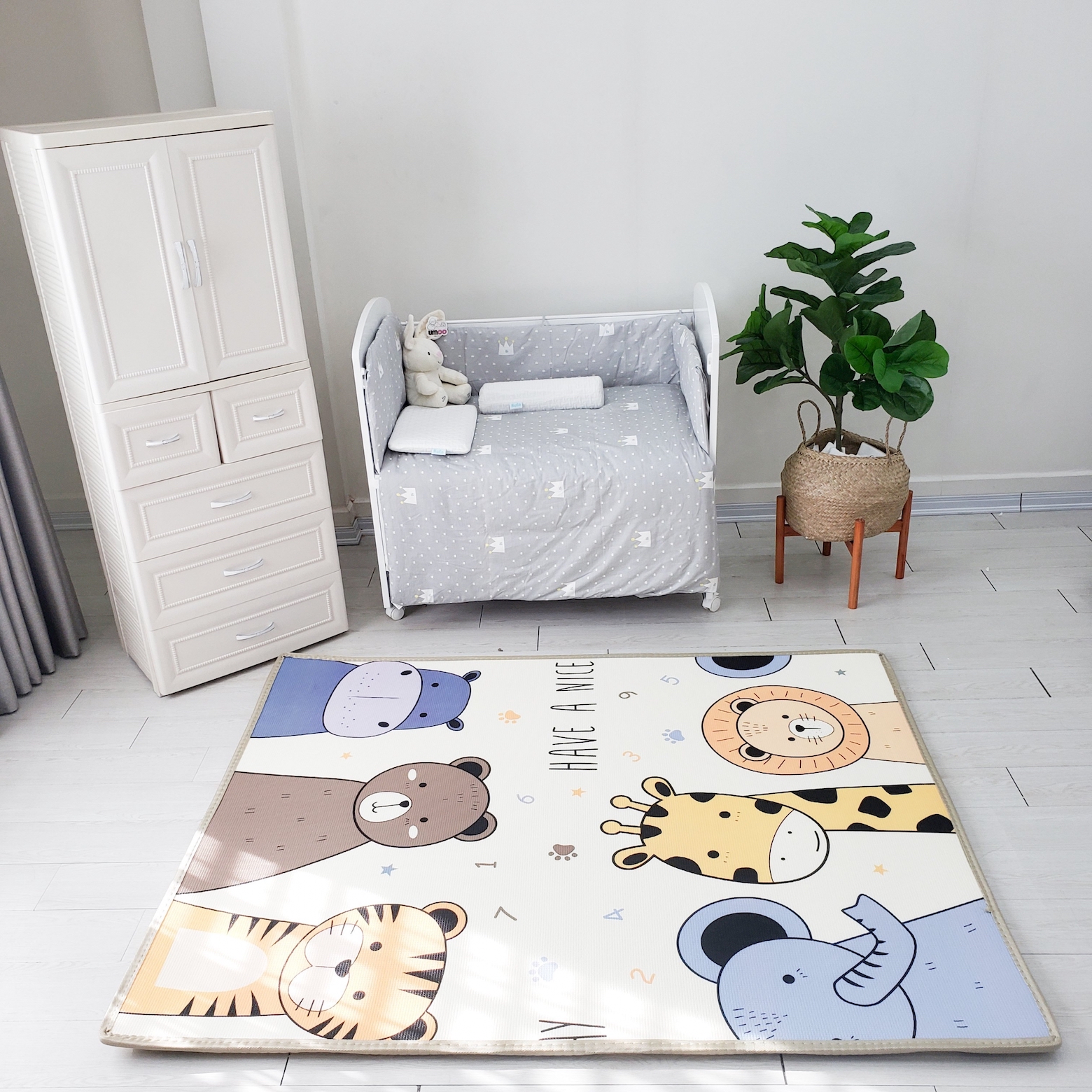 - Thảm XPE cao cấp không thấm nước, 2 mặt đều có thể dùng được và được in họa tiết sặc sỡ đáng yêu.