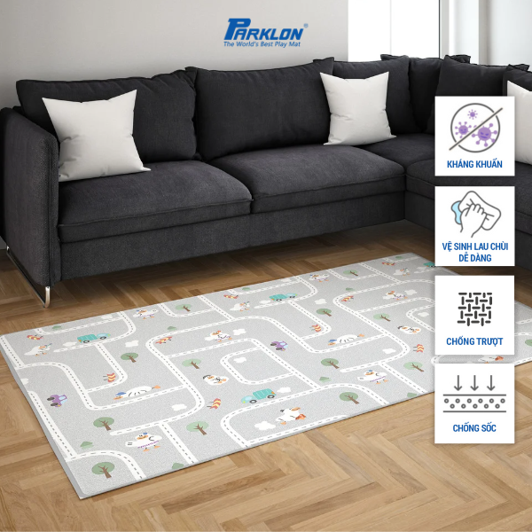 Mua tại TiktokThảm Trẻ Em Hàng Đầu Thế Giới Nhập Khẩu Chính Hãng Hàn Quốc Parklon Thương hiệu: Parklon Xuất xứ: Hàn Quốc Chất liệu: PE Họa Tiết: Thị Trấn Vịt Tuyết + Sàn Gỗ Kích thước: 200cmx150cmx1.5cm Độ bền: 10 năm Sau thời gian tung tăng, bé yêu dễ dàng xếp gọn chiếc thảm và cất đi. Trọng lượng thảm chỉ 200g vô cùng nhẹ nhàng. Bề mặt của thảm chống trơn trượt, không bám bẩn và hoàn toàn không thấm nước nên có thể dễ dàng làm sạch với khăn ướt. Giữ không gian sạch sẽ và an toàn cho các bé. Lỡ tung tăng quá đà, ngã cũng không sao. Độ dày của thảm lên đến 1,2 cm, độ ma sát cao và cực kỳ êm ái. Bảo vệ trẻ khỏi những tổn thương do té ngã. Ngoài ra, nhờ độ êm ái, thảm làm giảm 50% tiếng ồn từ các tác động lên mặt sàn. Giúp các bé có thể vui chơi thỏa thích. THẢM TRẺ EM HÀNG ĐẦU THẾ GIỚI CHÍNH HÃNG PARKLON: Bảo vệ con bạn khỏi sàn nhà cứng khi các bé tập bò, tập đứng hay tập đi. Thảm trẻ em Parklon được thiết kế đặc biệt để hấp thụ tác động và mang lại sự thoải mái hàng giờ cho các bé. ★ Chất liệu cao cấp được nhập khẩu từ Đức, kết hợp với công nghệ tiên tiến nhất của Parklon để tạo nên những chiếc thảm trẻ em hoàn hảo nhất. ★ Công nghệ chống sốc, chống va đập và giảm tiếng ồn được cải tiến giúp trẻ thoải mái vui chơi. ★ Thiết kế 2 mặt với hoa văn đặc biệt chống trơn trượt và công nghệ bo góc đặc biệt không gây nguy hiểm cho bé. ★ Công nghệ Nano kháng khuẩn quanh năm, không gây dị ứng, an toàn ngay cả với làn da của trẻ sơ sinh. ★ Khả năng chống nước 100% và dễ dàng vệ sinh, chỉ cần lau sạch vết bẩn bằng khăn. ★ Bề mặt thảm mềm mại, êm ái kết hợp cùng chất liệu đặc biệt giúp giữ ấm vào mùa đông, không nóng vào mùa hè. ★ Chất liệu thân thiện với môi trường, không chứa các chất độc hại và kim loại nặng. ★ Đạt chứng nhận an toàn từ tổ chức toàn cầu: KC, SGS, ISO 9001, An toàn Châu Âu EN71
