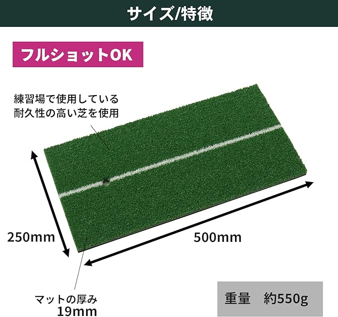 Thảm đánh Full shot 2WAY GV0264 trải nghiệm đầy đủ các mô phỏng sân golf thực tế. Kích thước đóng gói 435 × 265 (mm) Kích thước Kích thước thảm : 430 × 253mm Trọng lượng : Khoảng 1350g