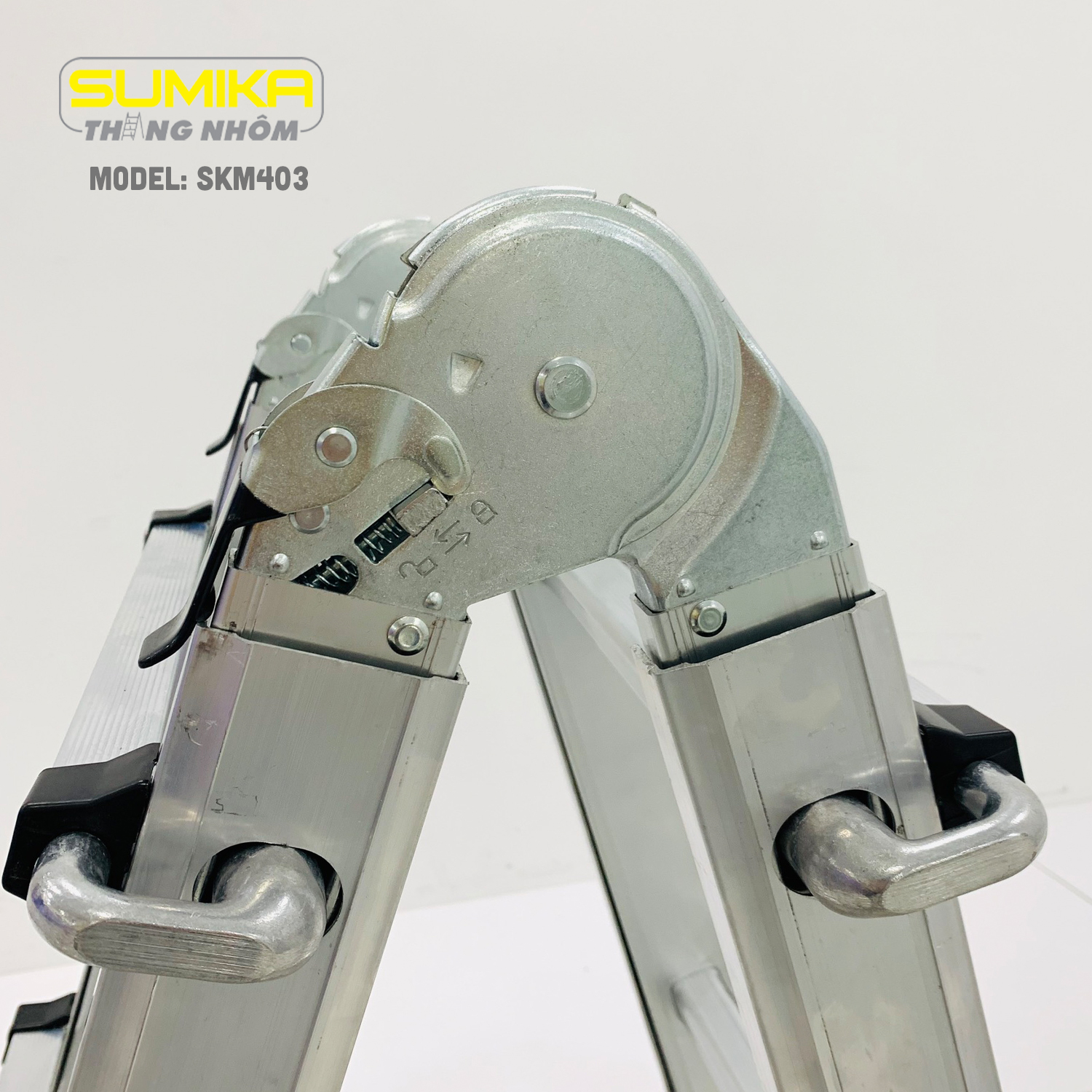 - SKM 403 là sự tổng hợp của thang nhôm chữ A, thang nhôm rút gọn và thang trượt. Ưu điểm lớn của loại thang này chính là có thể sử dụng giữa các bậc thang (cải tiến nhược điểm của thang chữ A).