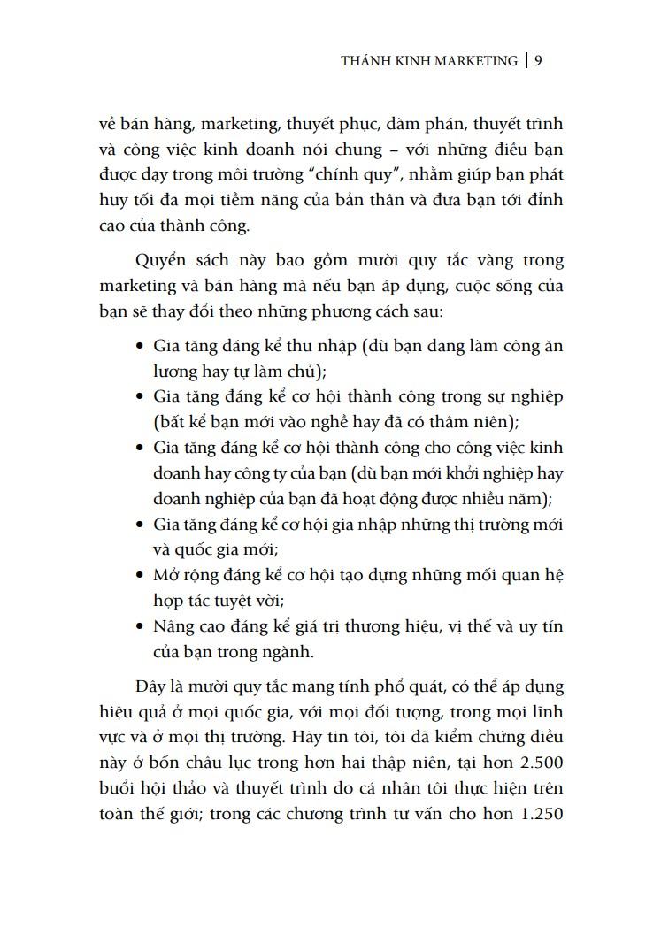 Trong bối cảnh kinh doanh hiện đại với nhịp độ vận hành nhanh và các mối tương tác đa dạng, những chiến thuật marketing truyền thống thường không đủ hiệu quả trong việc thu hút sự chú ý của khách hàng tiềm năng. Thời đại kỹ thuật số đã mở ra một kỷ nguyên mới cho ngành marketing – nơi sự sáng tạo là công cụ hiệu quả và sự đột phá là bí quyết thành công. Cuốn sách “Thánh kinh marketing” thu hẹp khoảng cách giữa những điều bạn nhất thiết phải biết về bán hàng, tiếp thị, thuyết phục, đàm phán, thuyết trình và công việc kinh doanh nói chung với những điều bạn được dạy trong môi trường “chính quy”, nhằm giúp bạn phát huy tối đa mọi tiềm năng và đưa bạn tới đỉnh cao của thành công. Tiến sĩ Yaniv Zaid mang đến cho độc giả của ông mười quy tắc vàng trong marketing, thương thuyết và bán hàng, những điều họ cần phải biết trong thế kỷ 21. Trong quá trình đi qua mười bí quyết, bạn học được những điều bạn chưa từng được dạy trong môi trường “chính quy” như: - Cách để định giá cao cho sản phẩm hay dịch vụ của bạn ngay cả khi thị trường bão hòa; - Cách để xây dựng thương hiệu cá nhân như một chuyên gia trong lĩnh vực bằng một cách thức sáng tạo, kể cả trong thị trường cạnh tranh; - Cách để biến những người không có ý định mua sản phẩm hay dịch vụ của bạn trở thành khách hàng thực thụ của bạn; - Làm thế nào để khán giả/khách hàng tiềm năng biết đến bạn; - Làm thế nào để tạo dựng xung quanh bạn một cộng đồng khách hàng tiềm năng ngày càng lớn mạnh; - Tiếp thị và bán hàng theo những cách khác biệt và hiệu quả hơn đối thủ; - Đưa khách hàng đi qua một quy trình thuyết phục trọn vẹn bằng nội dung tiếp thị; - Khiến nhiều người nhắc đến bạn nhiều nhất có thể; - Làm thế nào để người khác cảm thấy thoải mái khi tiếp xúc với bạn lần đầu; - Làm thế nào để tạo sự tín nhiệm và lòng tin từ người khác Đúc kết từ kinh nghiệm “thực chiến” của bản thân trong vai trò một chuyên gia marketing và doanh nhân, Yaniv Zaid chia sẻ những nguyên tắc cơ bản của marketing sáng tạo, dẫn dắt người đọc ra khỏi lối suy nghĩ thông thường để tiếp cận tư duy đột phá thông qua nhiều ví dụ thực tế đến từ các thương hiệu hàng đầu trong nhiều lĩnh vực khác nhau. Thông qua cách hành văn dí dỏm “viết như nói” đặc trưng của mình, Yaniv phân tích cách những thương hiệu này triển khai chiến lược kinh doanh dùng marketing sáng tạo làm đòn bẩy, tạo ra sự kết nối mật thiết hơn với khách hàng và đạt được thành công vượt trội trong thị trường đầy cạnh tranh của thế giới ngày nay. Điểm khác biệt của “Thánh kinh marketing” nằm ở sự chú trọng vào yếu tố con người. Giữa một thế giới đang bị thống trị bởi các thuật toán và công nghệ, Yaniv Zaid nhắc nhở chúng ta rằng cốt lõi của mọi chiến dịch quảng bá thành công chính là sự thấu hiểu về tâm lý và hành vi của con người. Khi chạm được đến cảm xúc và khát vọng của nhóm khách hàng mục tiêu, người làm marketing có thể phá vỡ ranh giới của quảng cáo truyền thống và tạo dựng được kết nối sâu sắc hơn với khách hàng. Yaniv Zaid còn tạo được một điểm nhấn khác cho tác phẩm của mình khi cho độc giả thấy rằng góc nhìn đa chiều có thể giúp nảy sinh những ý tưởng sáng tạo tuyệt vời nhất, từ đó khuyến khích các công ty áp dụng chiến lược marketing cởi mở, tận dụng sự đa dạng văn hóa trong chính tổ chức của mình. Một môi trường làm việc biết nuôi dưỡng tinh thần sáng tạo và đón nhận ý tưởng mới sẽ là bí quyết giúp các công ty tìm được cơ hội đột phá và phát triển bền vững. Không dừng lại ở đó, khi hoạt động marketing hài hòa với các giá trị xã hội, doanh nghiệp không chỉ thành công về mặt thương mại mà còn góp phần làm thế giới trở nên tốt đẹp hơn. Có thể thấy “Thánh kinh marketing” không phải là một quyển sách hướng dẫn làm marketing thông thường, mà là một công cụ giúp người đọc điều chỉnh góc nhìn và cách tiếp cận hoạt động marketing cũng như bán hàng trong thời đại kỹ thuật số. Chẳng hạn, bạn có thể nắm bắt được chiến thuật bán hàng tinh tế mà trong đó “bạn phát triển một cuộc trò chuyện với khách hàng và qua đó, bạn kín đáo chia sẻ cho khách hàng về những lợi ích của sản phẩm hay dịch vụ của bạn”. Hoặc bạn cũng có thể nắm vững nguyên tắc “sự hờ hững có lý trí” trong kinh tế học… Trong “Thánh kinh marketing”, Yaniv Zaid sẽ mang đến cho độc giả những ý tưởng hữu ích và phương pháp hiệu quả để giải phóng tiềm năng sáng tạo của chính mình và hướng tới thành tích tối ưu cho hoạt động kinh doanh. Bất kể bạn là một quản lý cấp cao, một CEO, một người khởi nghiệp, một doanh nhân hay người làm công ăn lương, bạn đều tìm thấy được những giá trị trong quyển sách này – c