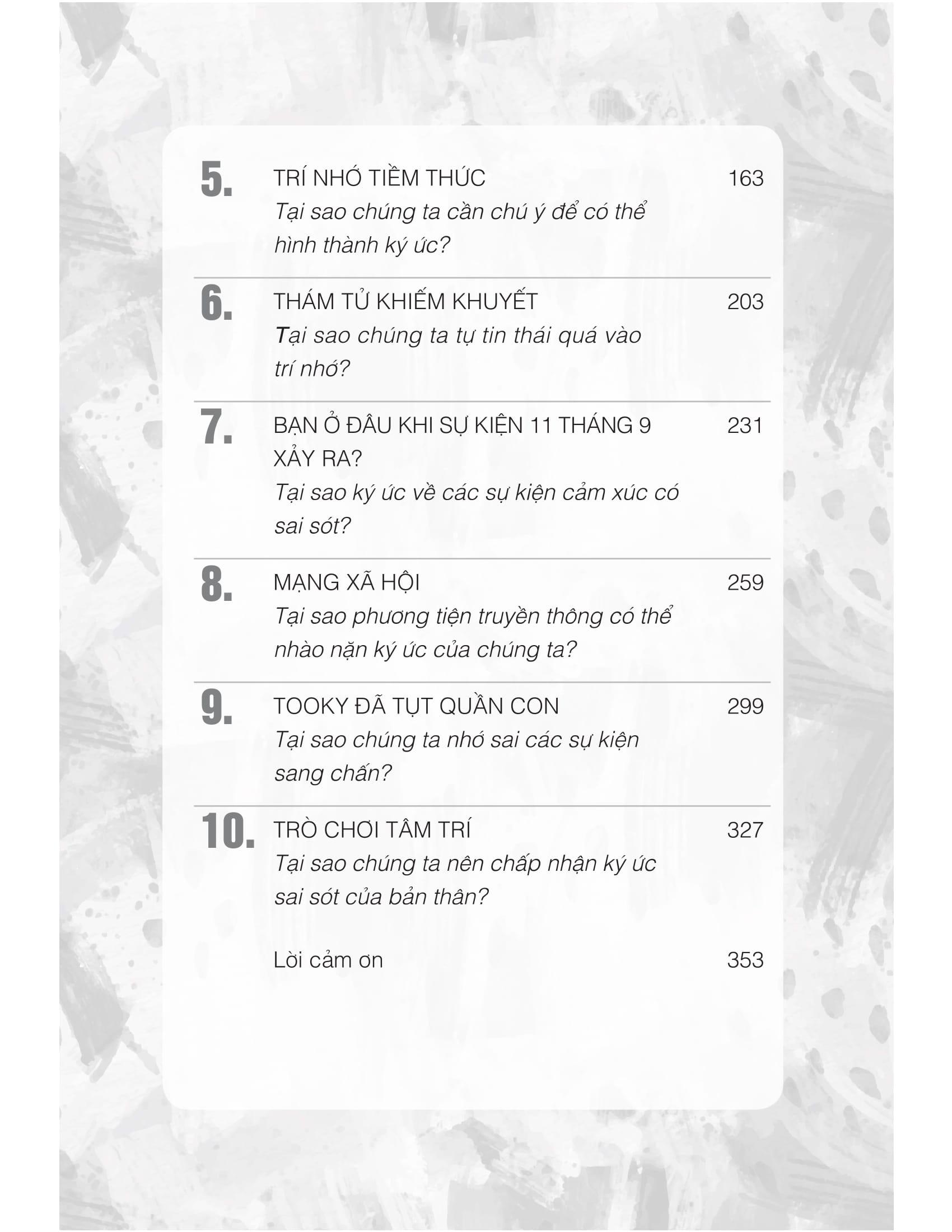 - Tác giả: Tiến sĩ Julia Shaw là một giảng viên và nhà nghiên cứu kỳ cựu của Trường Luật và Khoa học Xã hội, Đại học London South Bank, đồng thời là một trong số ít chuyên gia trên thế giới thực hiện nghiên cứu về những sai sót trí nhớ phức tạp liên quan đến các sự kiện cảm xúc cá nhân - hay còn gọi là những “ký ức sống động nhưng hoàn toàn không có thật”. Tiến sĩ Shaw xuất bản nhiều bài viết khoa học trên các tạp chí học thuật quốc tế, xây dựng giáo trình, thường xuyên cộng tác với tạp chí khoa học nổi tiếng Scientific American, thỉnh giảng và tham gia thuyết trình tại các hội thảo trên khắp thế giới. Cô cũng giảng dạy các lớp ở bậc đại học và sau đại học, đồng thời đã thắng hai giải thưởng dạy học xuất sắc.