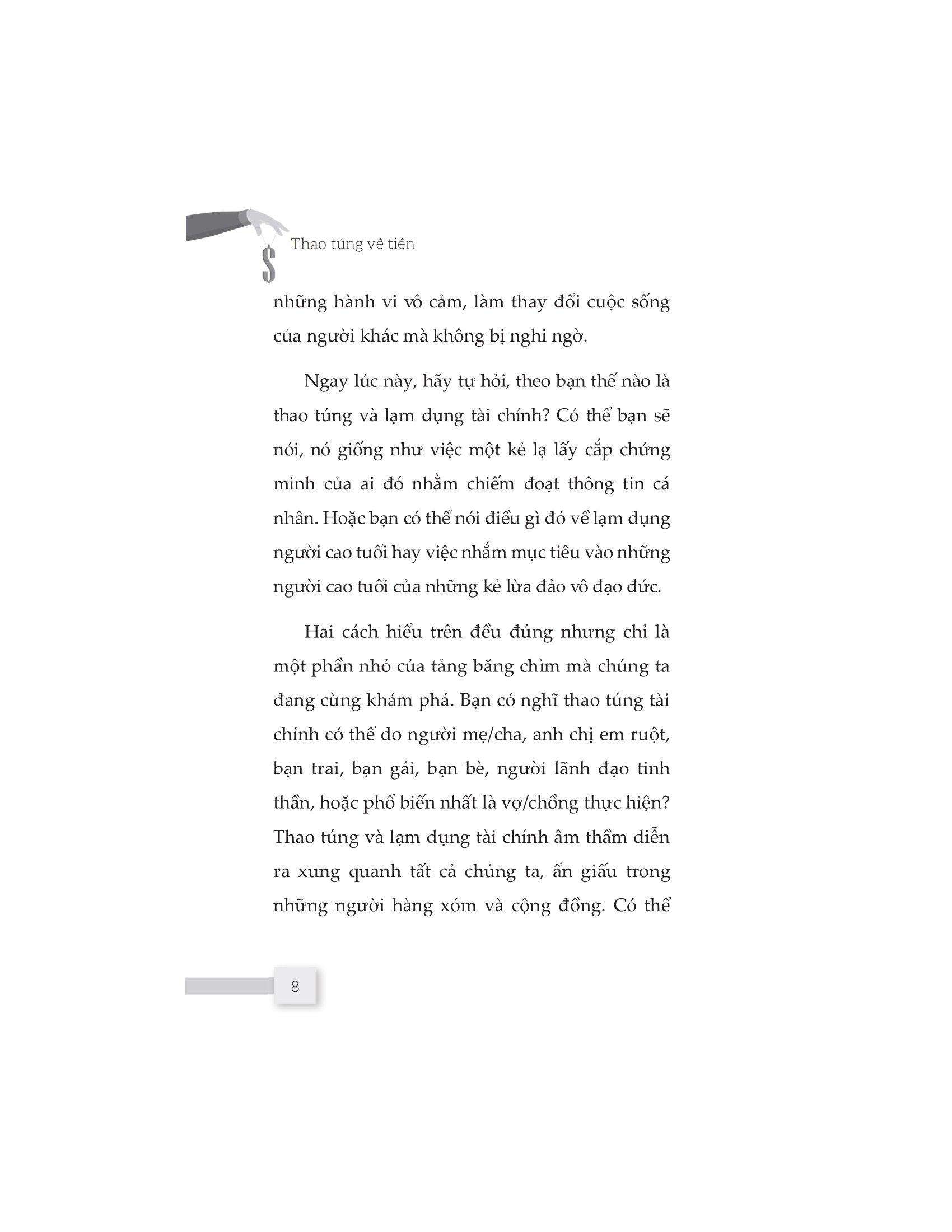 Cuốn sách “Thao túng về tiền” sẽ cho bạn cơ hội vén tấm màn che đậy và thấy được cuộc sống của những người bị tổn hại tài chính do những người thân thiết với họ gây ra. Nó cũng giúp bạn có được cái nhìn cụ thể và sâu sắc hơn về lạm dụng tài chính để nhận biết sớm, có hành động dứt khoát giúp bạn thoát khỏi hố sâu tâm lý và chữa lành những tổn thương tiềm ẩn.