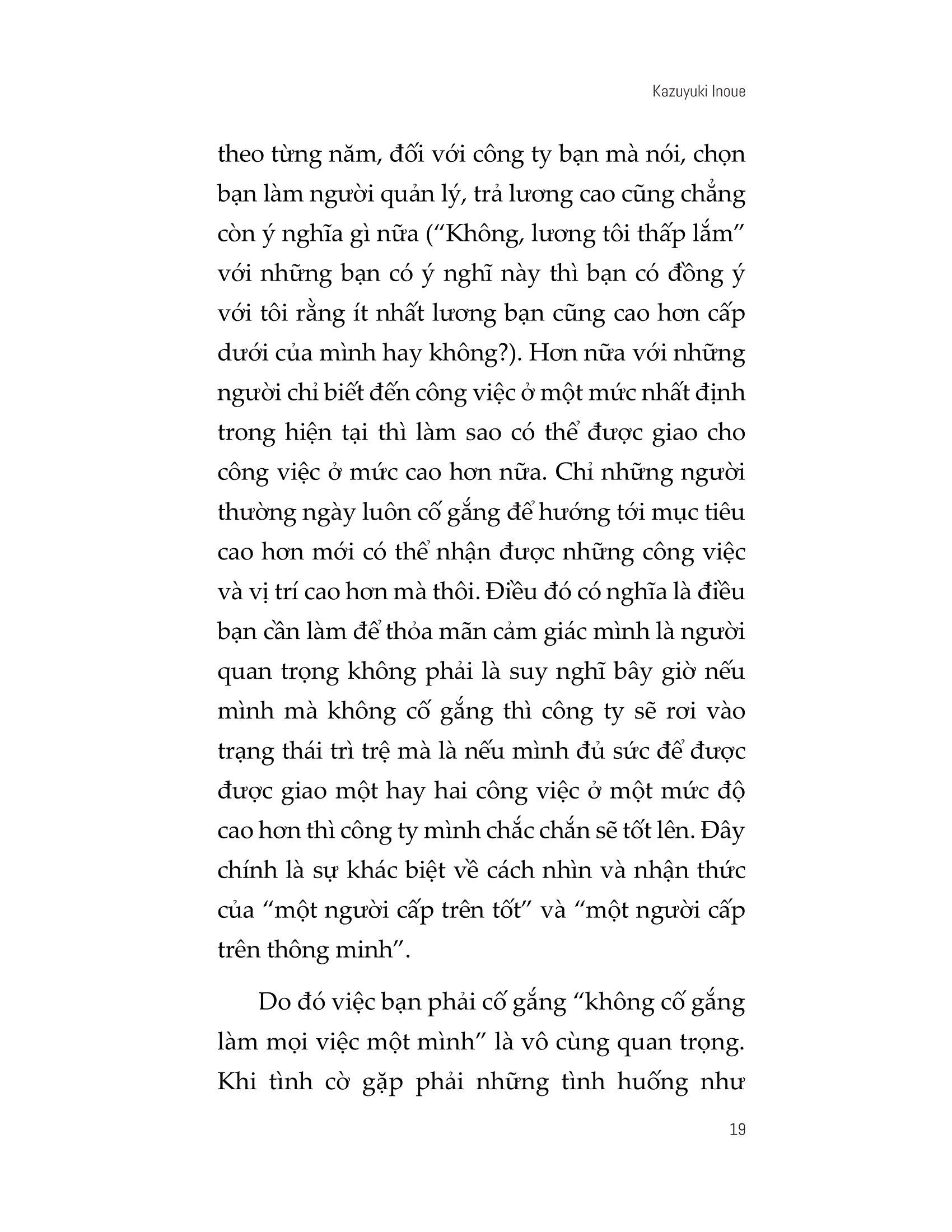 Chỉ những người thường ngày luôn cố gắng để hướng tới mục tiêu cao hơn mới có thể nhận được những công việc và vị trí cao hơn mà thôi. Điều đó có nghĩa là điều bạn cần làm để thỏa mãn cảm giác mình là người quan trọng không phải là suy nghĩ bây giờ nếu mình mà không cố gắng thì công ty sẽ rơi vào trạng thái trì trệ mà là nếu mình đủ sức để được được giao một hay hai công việc ở một mức độ cao hơn thì công ty mình chắc chắn sẽ tốt lên. Đây chính là sự khác biệt về cách nhìn và nhận thức của “một người cấp trên tốt” và “một người cấp trên thông minh”.