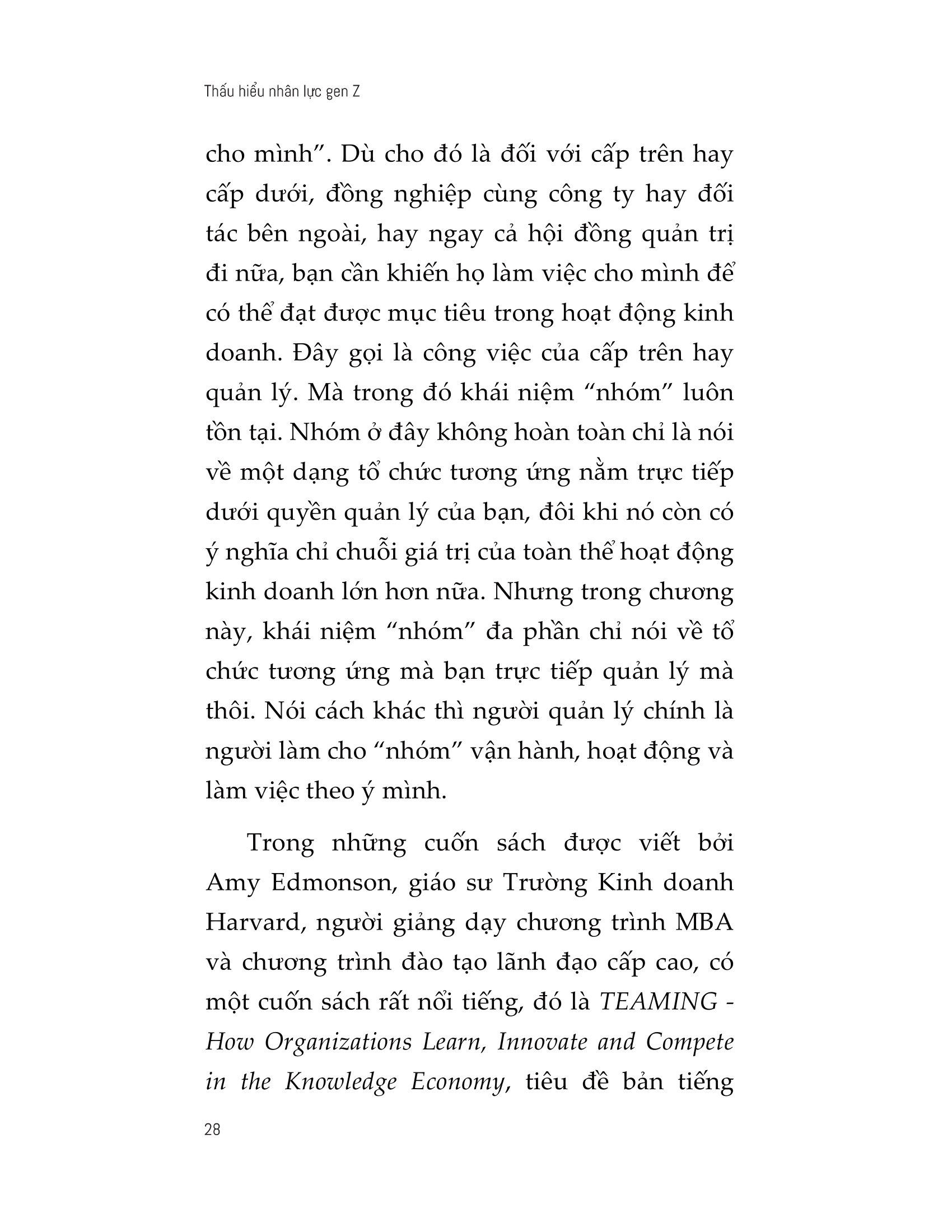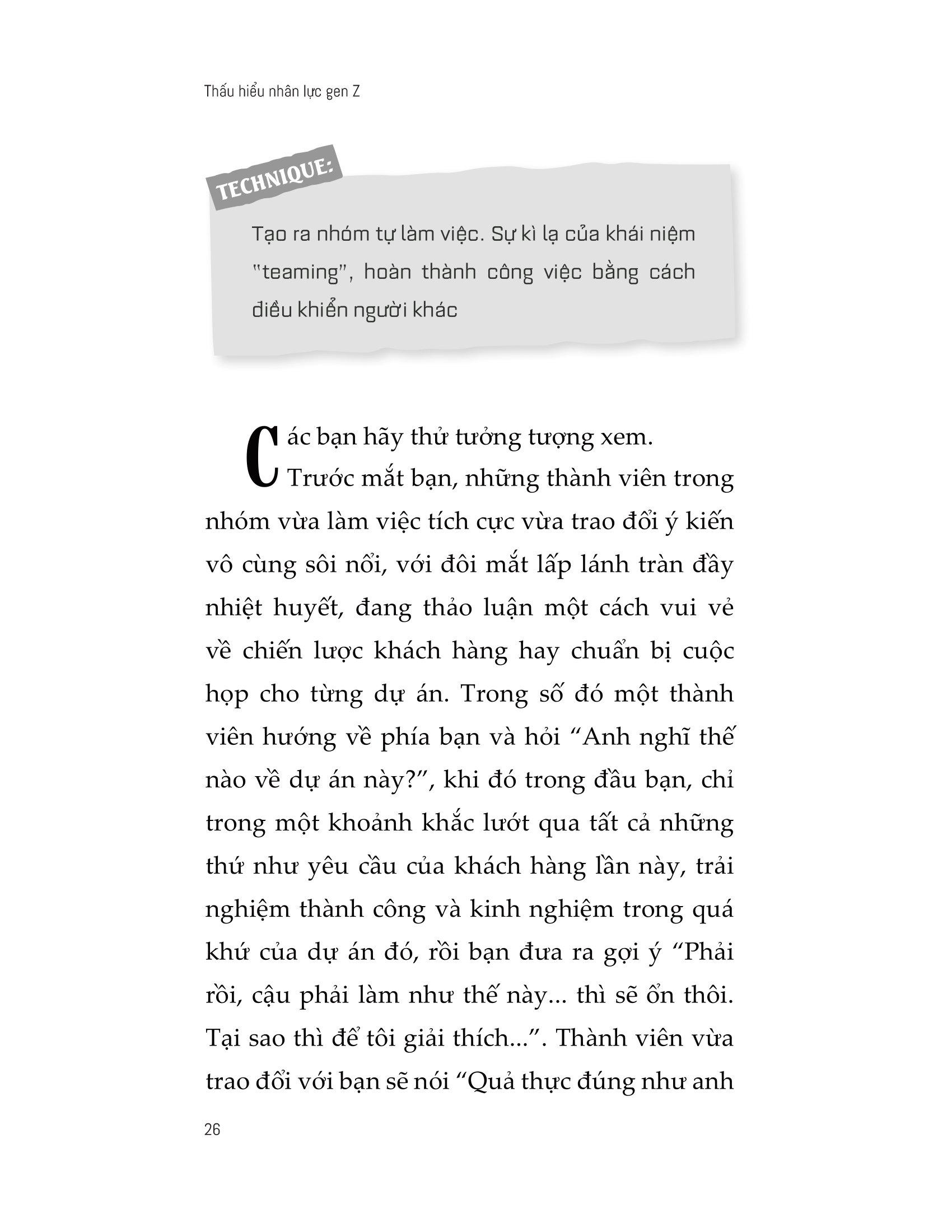 Cuốn sách « Thấu hiểu nhân lực gen Z » sẽ giúp bạn xác định mục tiêu của nhóm mà bạn quản lý là gì, từ đó làm rõ phương hướng, phương châm thực hiện để đạt được mục tiêu đó trong ngắn hạn, trung hạn, dài hạn, thực hiện chia sẻ quản lý tiến trình, và để tâm đến việc tạo động cơ động lực hướng đến hoàn thành mục tiêu. Trên cơ sở đó, bạn sử dụng kĩ năng quản lý thông minh một cách hợp lí sao cho thuận lợi cho bạn trong vai trò phụ trách nhóm.