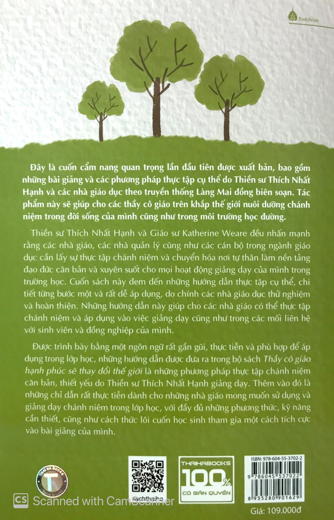 “Thầy cô giáo hạnh phúc sẽ thay đổi thế giới” – bộ sách bạn đang cầm trên tay là một món quà đặc biệt quan trọng – hay nói cách khác là một sự trao truyền – từ Thiền sư Thích Nhất Hạnh trao tặng vào giai đoạn chín muồi của một nhân cách vĩ đại. Bạn sẽ thấy rằng nó là kết tinh tình thương sâu sắc của Thiền sư đối với những người trẻ và sự mong mỏi không ngừng về một nền giáo dục bồi dưỡng tài và đức cho các thế hệ mai sau. Ở mỗi trang, bạn có thể cảm được sự tôn vinh dành cho những con người đang thực hiện sứ mệnh này, thường là âm thầm không ai biết, và khối lượng công việc khổng lồ mà họ gánh vác từng ngày nhằm phục vụ cho công cuộc kiến tạo, chuyển hóa và hàn gắn thế giới của chúng ta từ dưới lên, từ thế hệ này sang thế hệ khác – đó là những người thầy, người cô. Đây cũng đồng thời là tác phẩm được kết tinh từ sự cộng tác đầy cảm hứng với giáo sư Katherine Weare, một nhà giáo dục và cũng là một giáo viên về chánh niệm, người đã có nhiều năm nghiên cứu những tác động của thực tập chánh niệm trong môi trường học đường, và đội ngũ các cây bút cố vấn, những học trò lớn của Thiền sư từ Làng Mai. Cùng nhau họ đã thiết kế một cẩm nang thiền tập mang tính đa diện và rất dễ sử dụng để giúp các thầy cô giáo có thể đem chánh niệm vào lớp học cũng như vào đời sống của chính mình bằng nhiều hình thức.