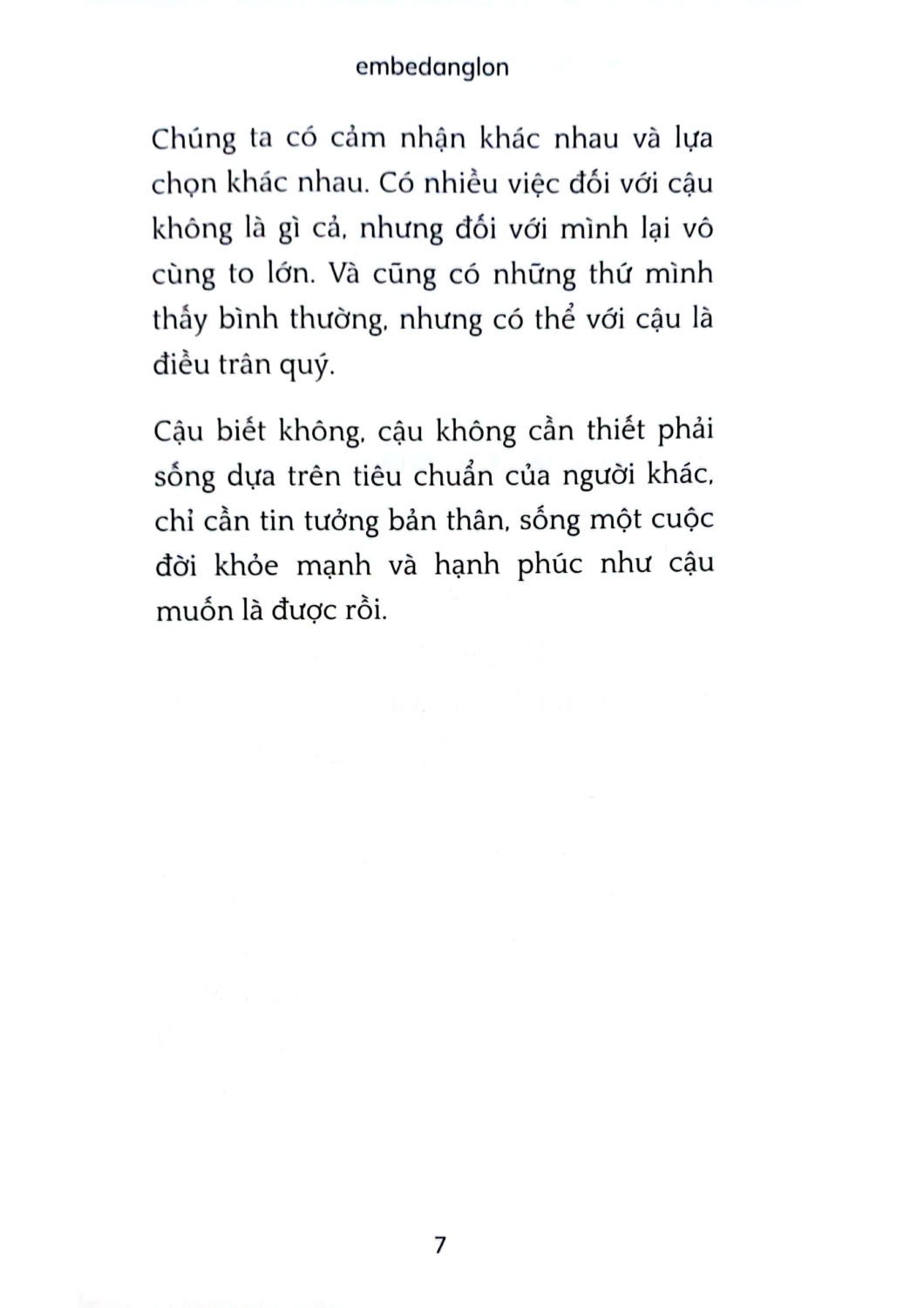 Bạn biết không, bạn không cần thiết phải sống dựa trên tiêu chuẩn của người khác, chỉ cần tin tưởng bản thân, sống một cuộc đời khỏe mạnh và hạnh phúc như bạn muốn là được rồi. Trong đời mỗi người đều có rất nhiều chặng đường phải vượt qua, có một con đường không thể quay lại mang tên thời gian, có một con đường không thể từ chối mang tên trưởng thành.