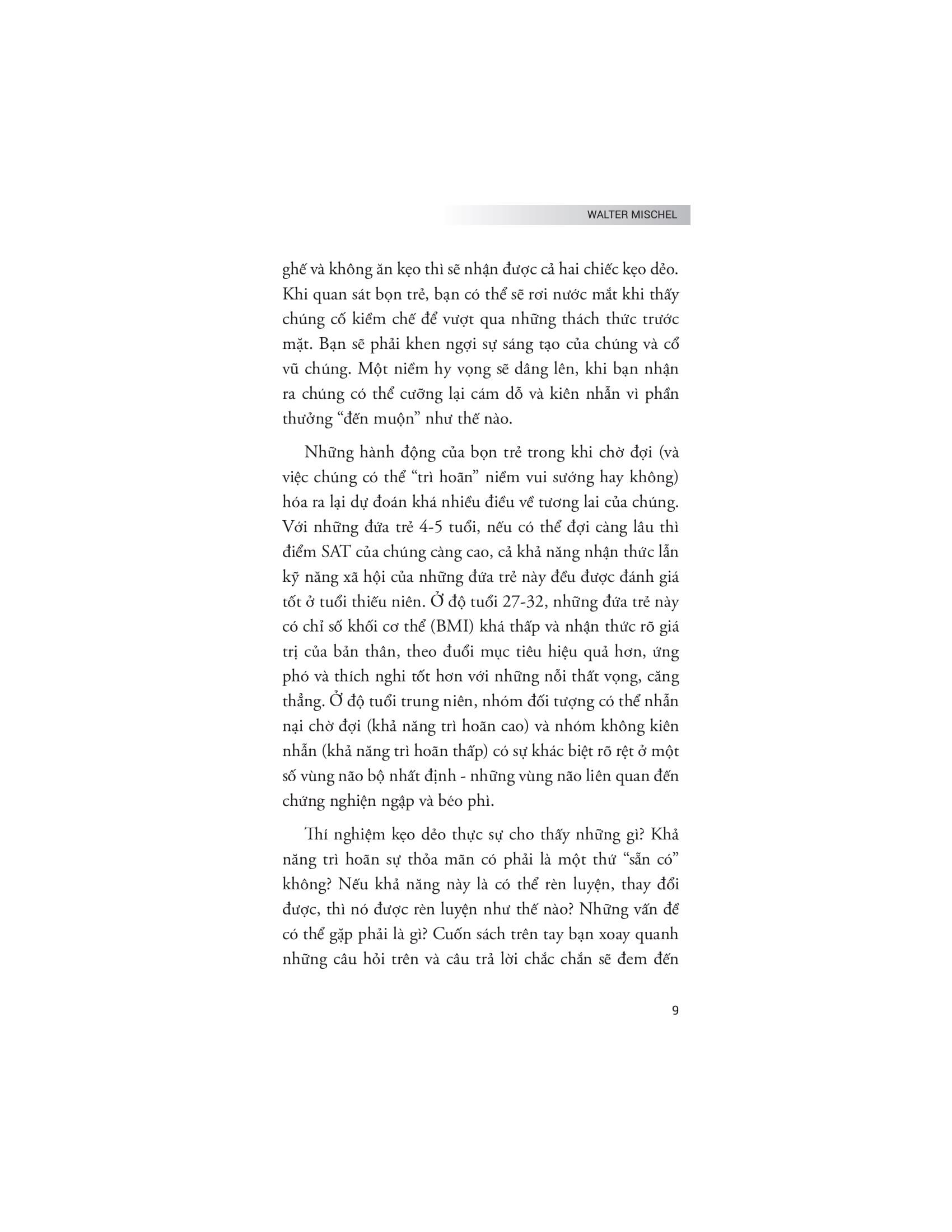 The Marshmallow Test - Hiệu Ứng Của Sự Cám Dỗ Và Khai Phá Sức Mạnh Của Ý Chí Tự Chủ Để Kiểm Soát Bản Năng Cuốn sách The Marshmallow Test của Walter Mischel là một tác phẩm nổi tiếng trong lĩnh vực tâm lý học, tập trung vào việc khám phá và nâng cao khả năng tự kiểm soát, một yếu tố quan trọng giúp cá nhân đạt được thành công và hạnh phúc trong cuộc sống. Dựa trên thí nghiệm kinh điển "Bài kiểm tra kẹo dẻo" (Marshmallow Test), cuốn sách không chỉ phân tích mối liên hệ giữa khả năng kiềm chế bản thân từ khi còn nhỏ và thành công trong cuộc sống sau này mà còn đưa ra những hướng dẫn thiết thực về cách cải thiện kỹ năng tự chủ này. Thí nghiệm Marshmallow Test, được Mischel và các cộng sự thực hiện vào những năm 1960, yêu cầu các em nhỏ phải chọn lựa giữa việc ăn ngay một viên kẹo dẻo hoặc chờ đợi một khoảng thời gian để nhận thêm một viên nữa. Kết quả của thí nghiệm cho thấy những em nhỏ có khả năng kiên nhẫn và chờ đợi lâu hơn (tức là có khả năng tự kiểm soát tốt hơn) thường có thành công vượt trội trong các lĩnh vực học tập, nghề nghiệp, và kỹ năng sống khi trưởng thành. Điều này cho thấy khả năng kiểm soát bản thân có thể dự báo nhiều yếu tố quyết định sự thành công lâu dài trong cuộc sống. Tác giả Walter Mischel đi sâu vào phân tích các chiến lược và phương pháp giúp cải thiện khả năng tự kiểm soát, từ việc xây dựng ý chí mạnh mẽ đến việc áp dụng các chiến lược tinh thần để đối phó với cám dỗ và duy trì kiên nhẫn. Bên cạnh đó, tác giả cũng chỉ ra những yếu tố ảnh hưởng đến ý chí và sự kiểm soát bản thân, từ môi trường, cách giáo dục đến các yếu tố tâm lý cá nhân. Bằng cách ứng dụng những bài học từ thí nghiệm kẹo dẻo vào cuộc sống thực tế, The Marshmallow Test không chỉ giúp người đọc hiểu rõ hơn về bản chất của tự kiểm soát mà còn cung cấp những cách thức và chiến lược hữu ích để rèn luyện khả năng này. Cuốn sách phân tích cách sự kiểm soát bản thân có thể ảnh hưởng đến nhiều khía cạnh trong cuộc sống, từ việc duy trì sức khỏe tốt, xây dựng sự nghiệp thành công đến phát triển các mối quan hệ cá nhân bền vững. Rất nhiều khía cạnh thú vị và ý nghĩa về năng lực tự chủ đã được các nhà nghiên cứu dày công tìm hiểu. Kết quả rút ra từ công trình này – sẽ giúp các bạn độc giả có một cái nhìn toàn cảnh và chuyên sâu về một trong những kỹ năng thiết yếu nhất của con người. Về tác giả Walter Mischel là nhà tâm lý học người Mỹ chuyên về lý thuyết nhân cách và tâm lý xã hội. Ông là giáo sư tại khoa Tâm lý học, Đại học Columbia. Năm 2007, Mischel được bầu làm chủ tịch Hiệp hội Khoa học Tâm lý. Ông là biên tập viên của tạp chí Psychological Review, đồng thời giữ chức chủ tịch của Hiệp hội Nghiên cứu Tính cách. Năm 2011, Mischel nhận Giải thưởng Grawemeyer về Tâm lý học của Đại học Louisville cho các nghiên cứu của ông về khả năng tự kiểm soát bản thân.