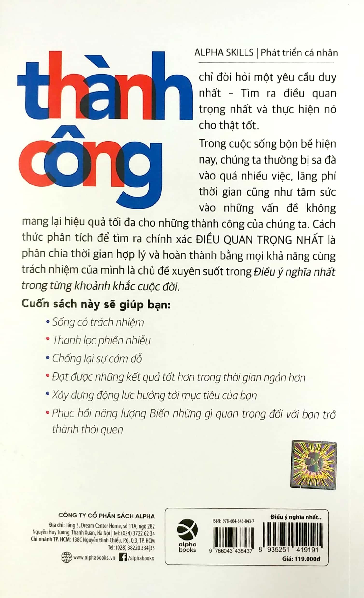 Giờ đây, bạn có thể có cả hai thứ, ít và nhiều. Trong The one thing - Điều ý nghĩa nhất trong từng khoảnh khắc cuộc đời, bạn sẽ học được cách nhìn xuyên qua được sự hỗn độn nhiễu loạn để đạt được kết quả tốt hơn trong thời gian ngắn hơn, tạo ra đòn bẩy đưa bạn đến mục tiêu, giảm sự ức chế tâm lý, chế ngự được cảm giác đó, đem lại năng lượng cho bản thân, tiếp tục đi đúng hướng và làm chủ những điều thực sự quan trọng với bạn. Cuốn sách này đem lại những kết quả kinh ngạc trong mọi lĩnh vực của đời sống, công việc, cá nhân, gia đình, và tinh thần của mỗi người.