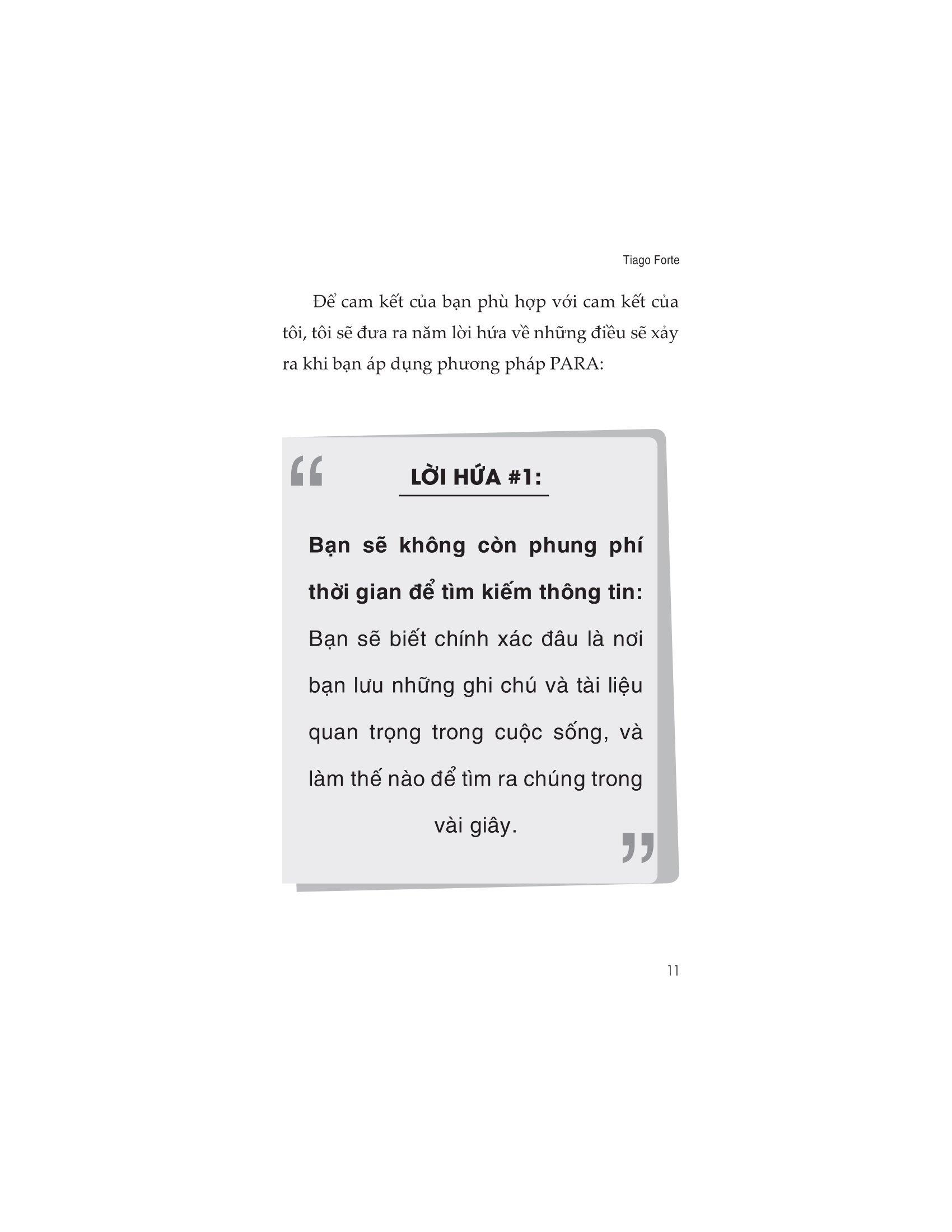 Cuộc sống hiện đại đòi hỏi phải xử lý rất nhiều thông tin. Nhưng chúng ta chưa bao giờ được dạy cách quản lý thông tin một cách hiệu quả để có thể tìm thấy thứ m.ình cần. Trong The PARA METHOD – Phương pháp tổ chức thông tin trong công việc, Tiago Forte phác thảo một hệ thống bốn bước đơn giản và trực quan sẽ giúp chúng ta sắp xếp tất cả thông tin tràn ngập trong não thành bốn loại chính. Theo đó PARA là từ viết tắt của “Projects” (Dự án), “Areas” (Lĩnh vực), “Resources” (Tài nguyên) và “Archives” (Lưu trữ).