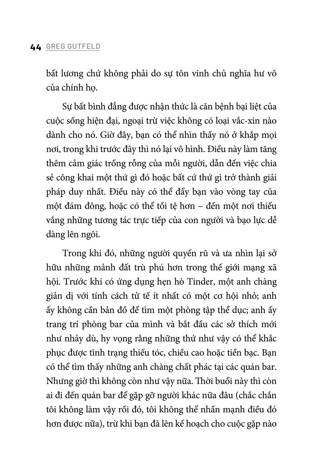 Trong sách Self help cho người ghét self help, tác giả Greg Gutfeld cho thấy tất cả mọi người có thể cải thiện cuộc sống của họ và hàn gắn cộng đồng của họ. Trong sách, tác giả hướng dẫn bạn những cách "thôi miên" bản thân để có những hành vi tốt hơn, giữ lại những điểm tích cực/tốt đẹp trong cuộc sống của bạn và loại bỏ những điểm tiêu cực/yếu đuối.
