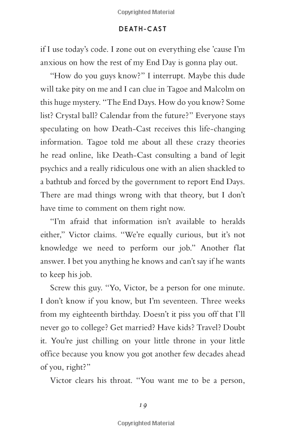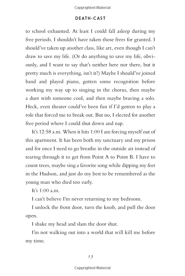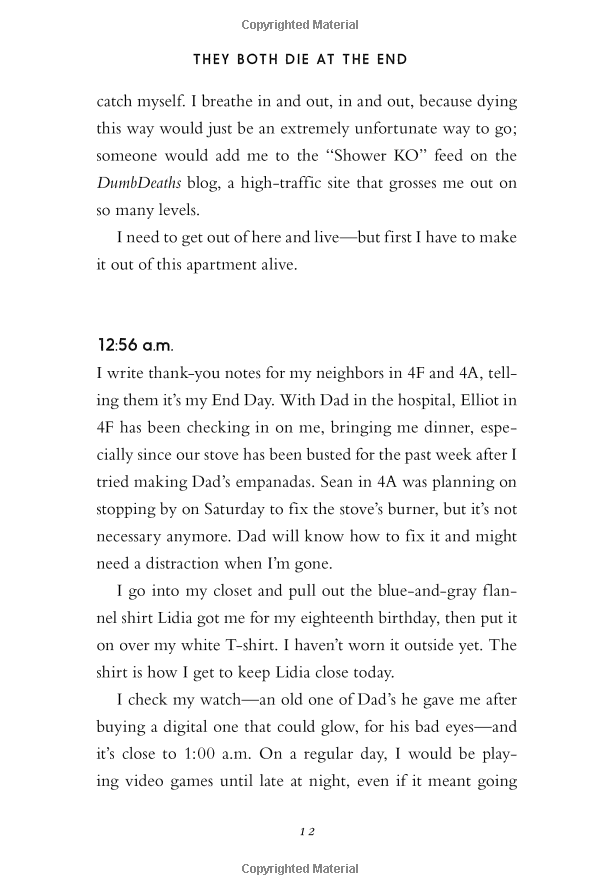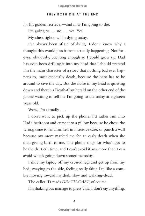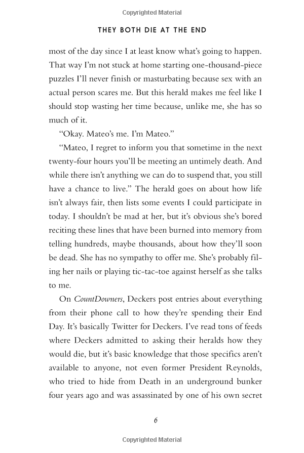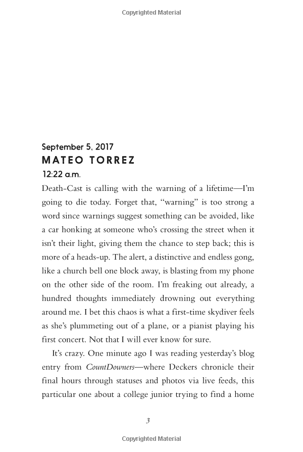 On September 5, a little after midnight, Death-Cast calls Mateo Torrez and Rufus Emeterio to give them some bad news: They're going to die today.