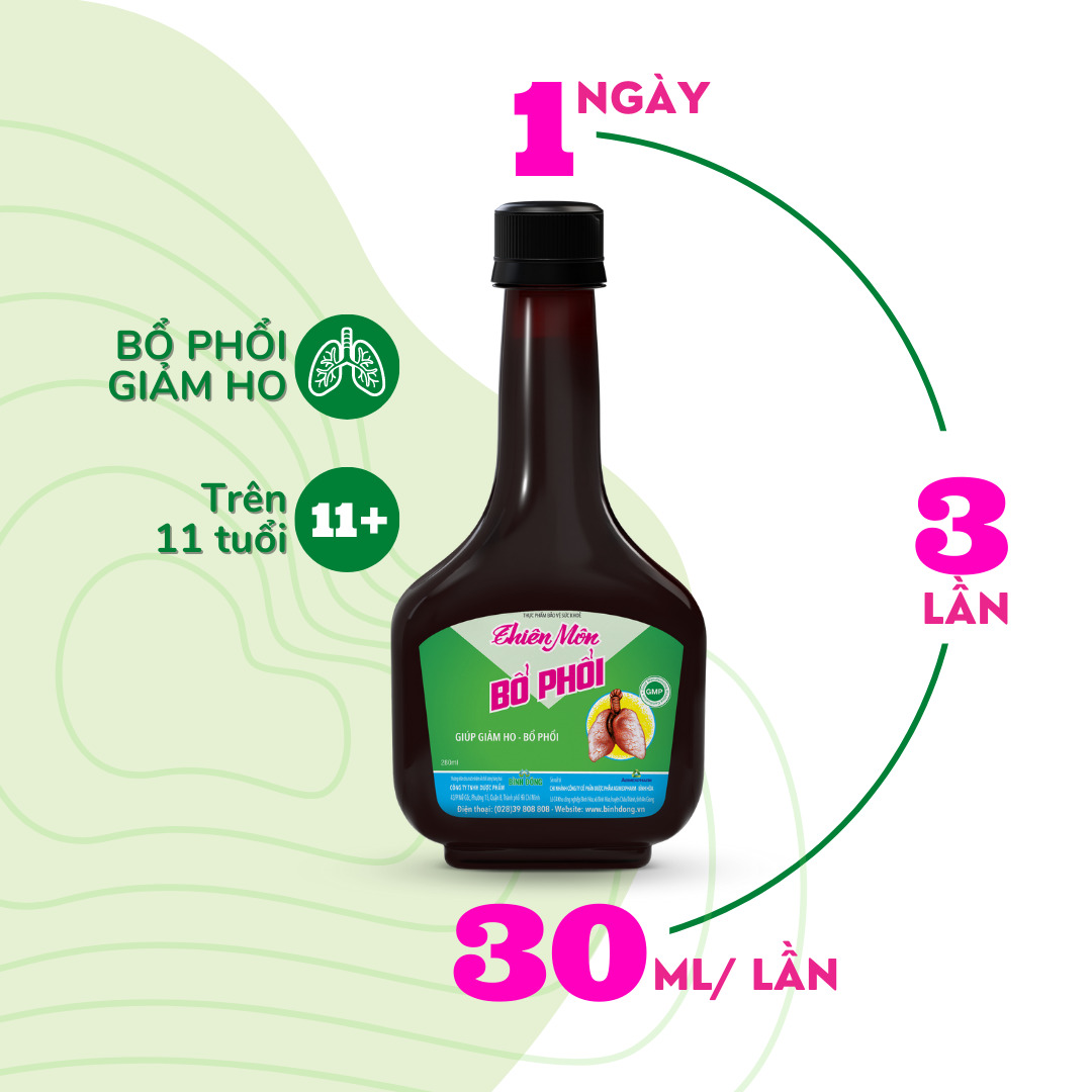 Phổi là cơ quan rất quan trọng trong cơ thể người, có vai trò chính là trao đổi khí – mang O2 từ không khí vào tĩnh mạch phổi và đưa CO2 từ động mạch phổi ra bên ngoài. Ngoài ra, Phổi còn có chức năng chuyển hóa một số chất, lưu trữ máu và lọc các độc tố trong máu.  Trong Đông Y, Phổi tương ứng với Tạng Phế, được chia thành Phế âm và Phế dương. Khi Phế suy yếu sẽ dẫn đến tình trạng ho khan, ho có đờm, ho về đêm, ho lâu ngày, cơ thể mệt mỏi và khó thở. Vì vậy, bổ phổi là điều rất cần thiết để chúng ta duy trì sức khỏe tốt. Thiên Môn Bổ Phổi kế thừa tinh hoa của nền Y học cổ truyền Việt Nam và là sự kết hợp của những vị thuốc Đông Y gồm: Thiên Môn Đông, Trần Bì, Bình Vôi, Kinh Giới, Bạc Hà, Gừng, Bách Bộ, Tang Bạch Bì và Atiso giúp bổ phổi, giảm ho hiệu quả và hỗ trợ giảm các triệu chứng ho khan, ho gió, ho có đờm, ho lâu ngày, ho về đêm, viêm họng, viêm phế quản,… Với thành phần thảo dược cực kỳ an toàn và lành tính, đây chính là thực phẩm bảo vệ sức khỏe chất lượng mà bạn không thể bỏ qua. Nhà phân phối: Công ty TNHH Dược Phẩm Bình Đông Số công bố: 8728/2020/ĐKSP Hạn sử dụng: 36 tháng kể từ ngày sản xuất (được in trên bao bì) Quy cách: Chai 280 ml dạng cao lỏng THÀNH PHẦN Thiên Môn Đông – 5,6 g Bạc Hà – 8,4 g Bách Bộ – 8,4 g Trần Bì – 5,6 g Tang Bạch Bì – 5,6 g Bình Vôi – 5,6 g Gừng – 2,8 g Kinh giới – 2,8 g Atiso – 2,8 g Phụ liệu: Đường kính, Natri benzoat, nước tinh khiết vừa đủ.