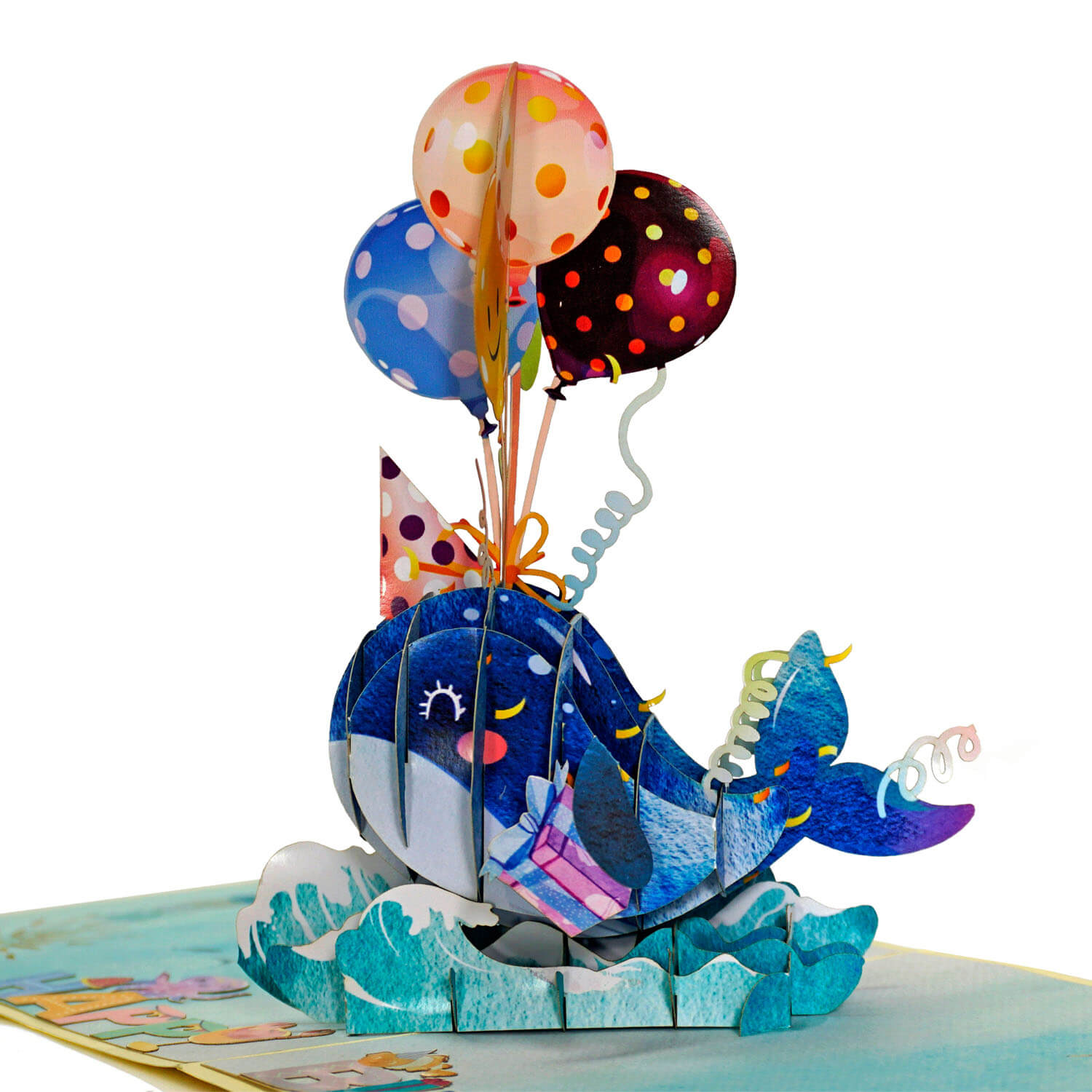 Mang đến bất ngờ vui nhộn với thiệp 3D Pop Up hình cá voi xanh đáng yêu kèm bong bóng sinh nhật đầy màu sắc. Khi mở thiệp, cá voi bật nổi giữa làn sóng
